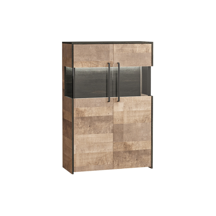 Витрина с подсветкой эффектно подчёркивает аксессуары, а брутальный декор и контрастная кромка придают мебели индустриальную эстетику.