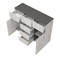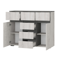 Комод Мрия КМ-15 — это стильный и функциональный предмет мебели, состоящий из двух боковых зон с полками и шести ящиков.