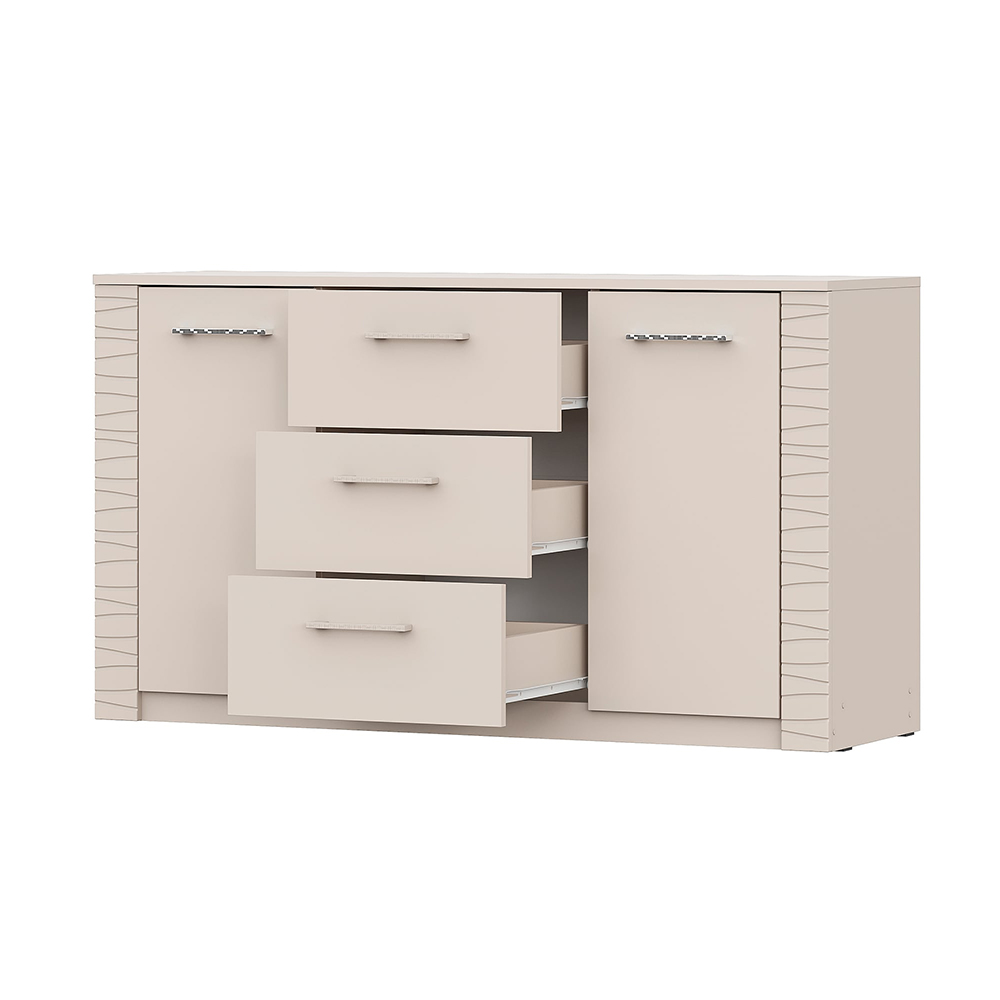 Комод двухстворчатый Калипсо - это универсальный предмет мебели, который идеально подойдет для организации пространства в любом доме. Этот комод выполнен из качественных материалов, что обеспечивает его долговечность и устойчивость к повреждениям. Три выдвижных ящика предоставляют удобное и практичное решение для хранения различных предметов: от предметов гардероба до мелких вещей и аксессуаров. Ящики легко открываются и закрываются, благодаря надежным роликовым направляющим.