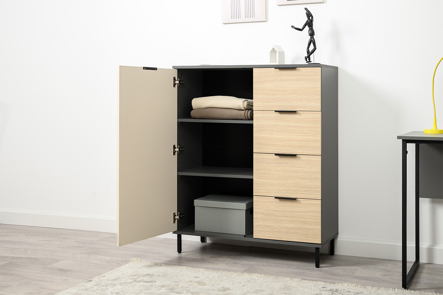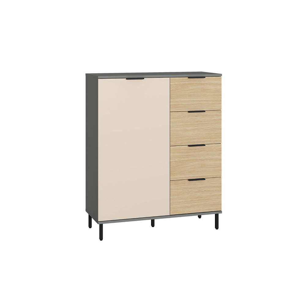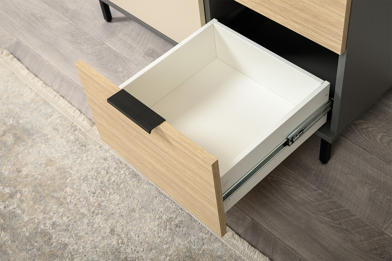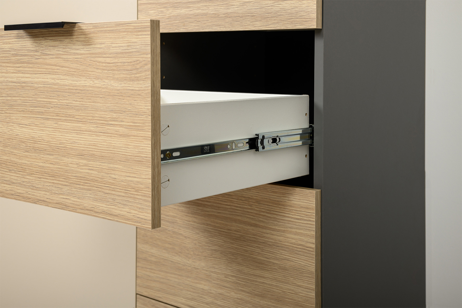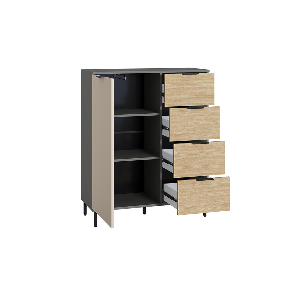 Каждый ящик оснащен надежными шариковыми направляющими, обеспечивающими плавное и бесшумное открытие и закрытие. Просторные ящики позволяют удобно хранить одежду, белье или другие предметы, поддерживая порядок в доме.