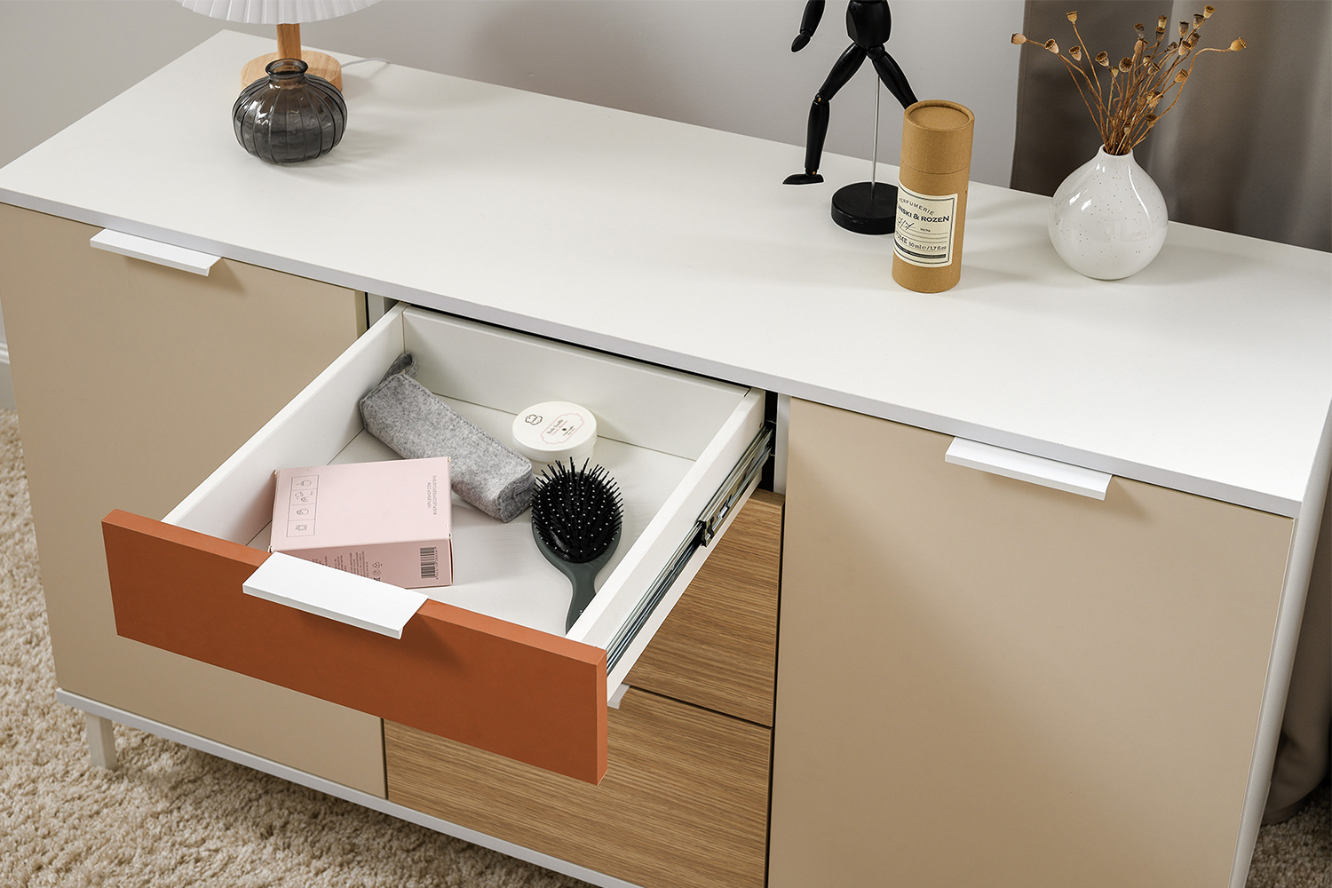 Каждый ящик оснащен надежными шариковыми направляющими, обеспечивающими плавное и бесшумное открытие и закрытие. Просторные ящики позволяют удобно хранить одежду, белье или другие предметы, поддерживая порядок в доме.