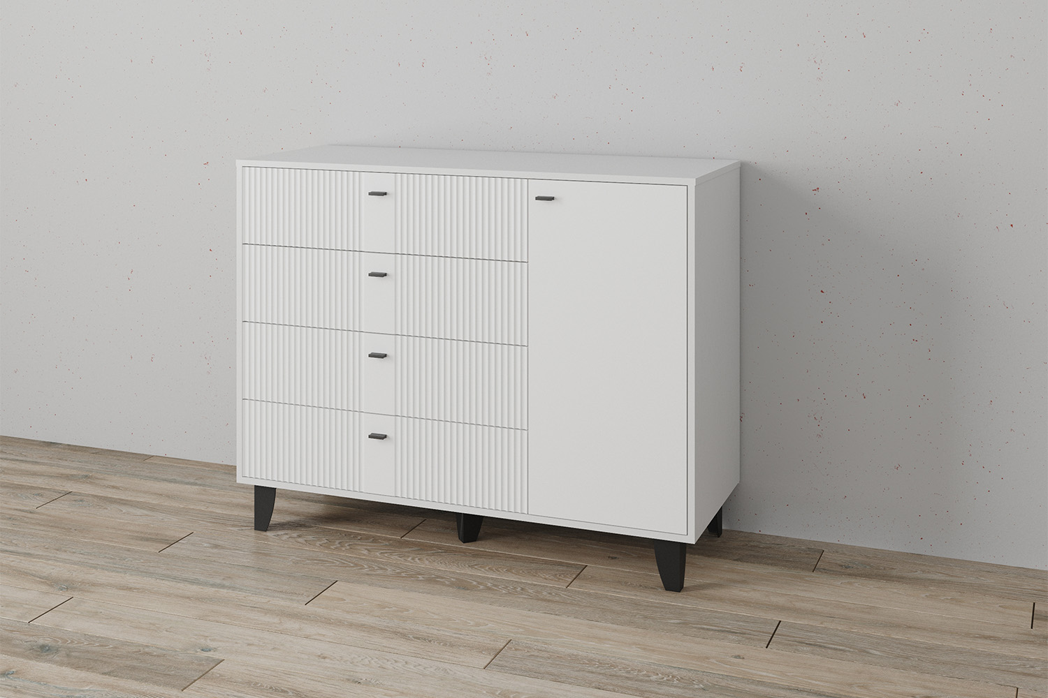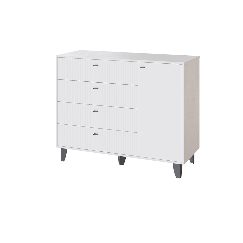 Комод Катрин-13 — это стильный и функциональный элемент интерьера, который станет отличным дополнением к вашей спальне или гостиной. Он выполнен в современном стиле и имеет комбинированную конструкцию, четыре выдвижных ящика и полки за распашными фасадами.