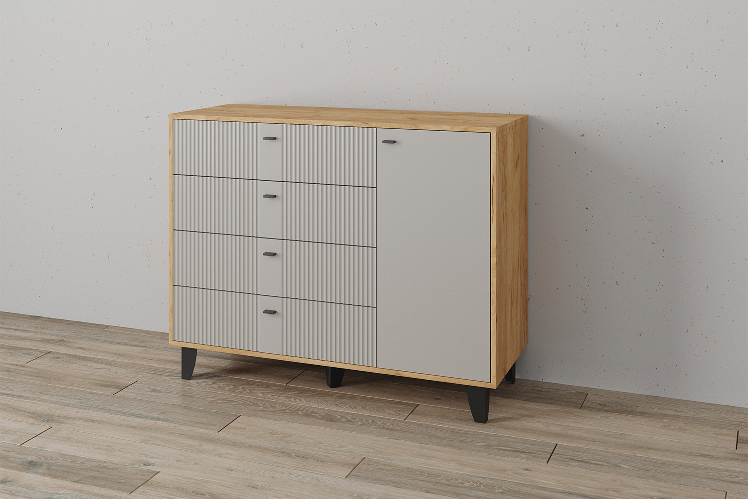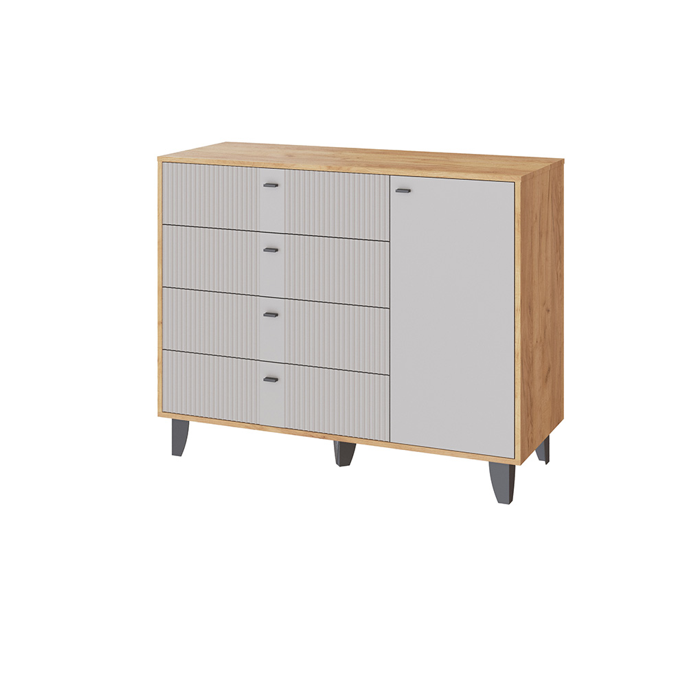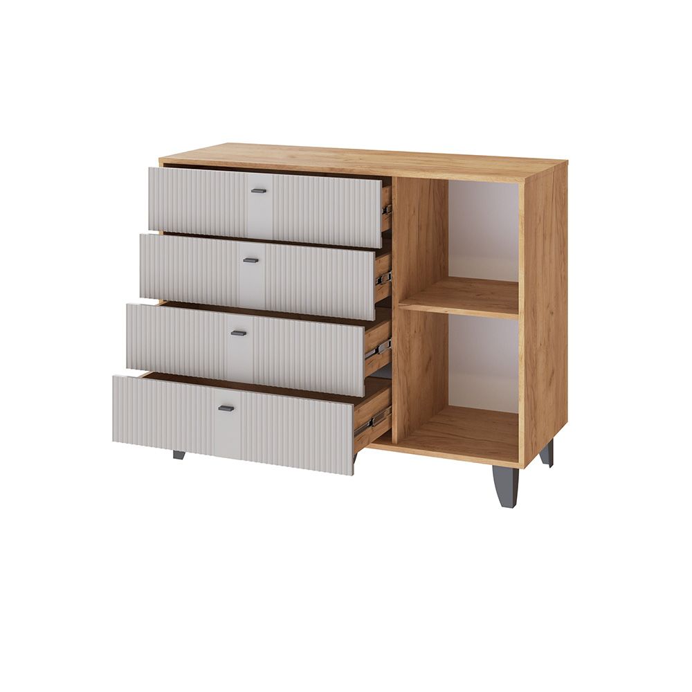 Комод Катрин-13 — это стильный и функциональный элемент интерьера, который станет отличным дополнением к вашей спальне или гостиной. Он выполнен в современном стиле и имеет комбинированную конструкцию, четыре выдвижных ящика и полки за распашными фасадами.
