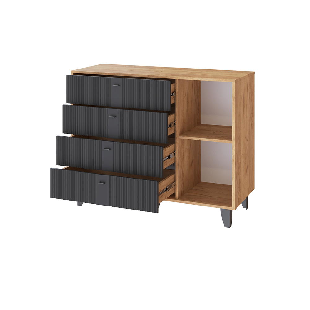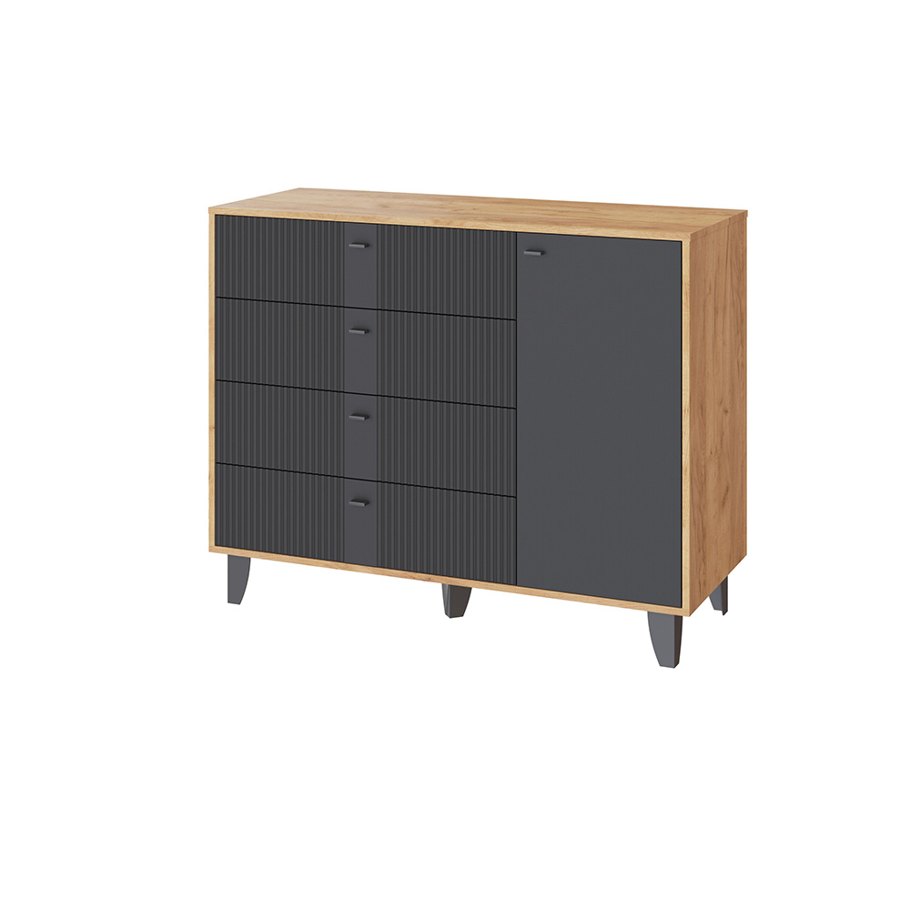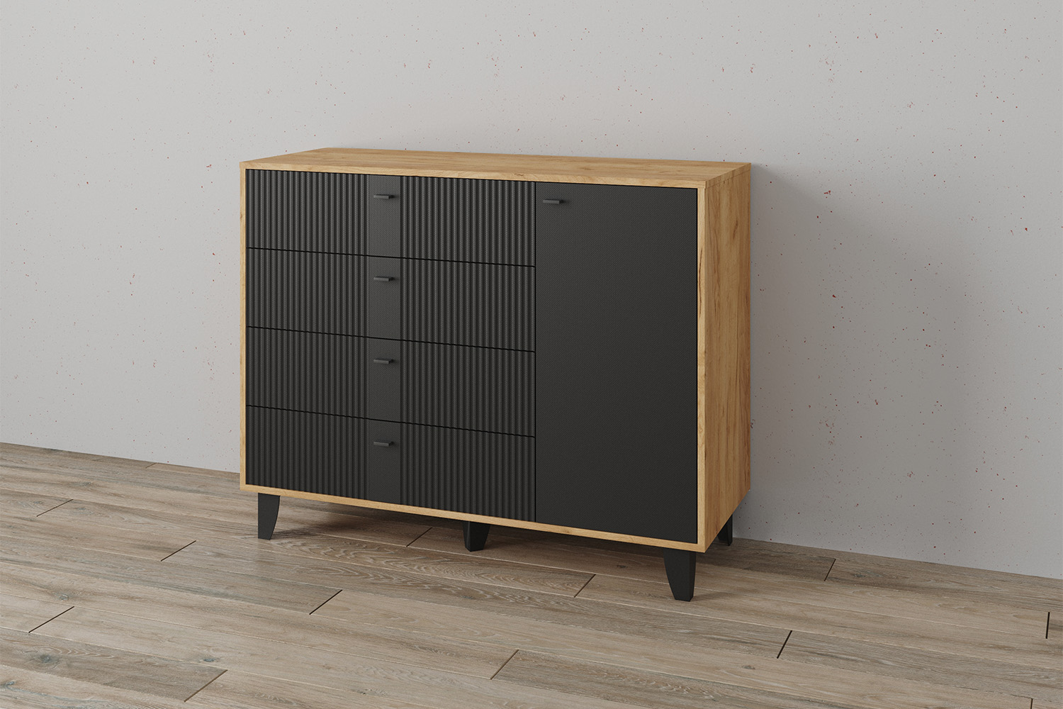 Комод Катрин-13 — это стильный и функциональный элемент интерьера, который станет отличным дополнением к вашей спальне или гостиной. Он выполнен в современном стиле и имеет комбинированную конструкцию, четыре выдвижных ящика и полки за распашными фасадами.