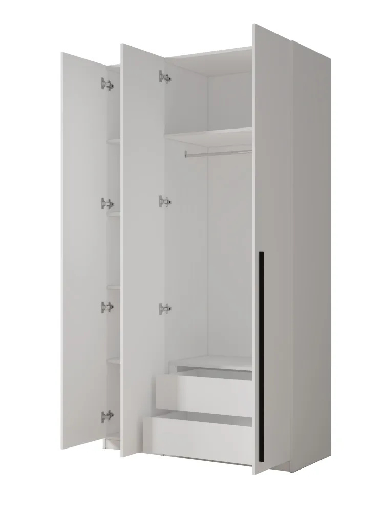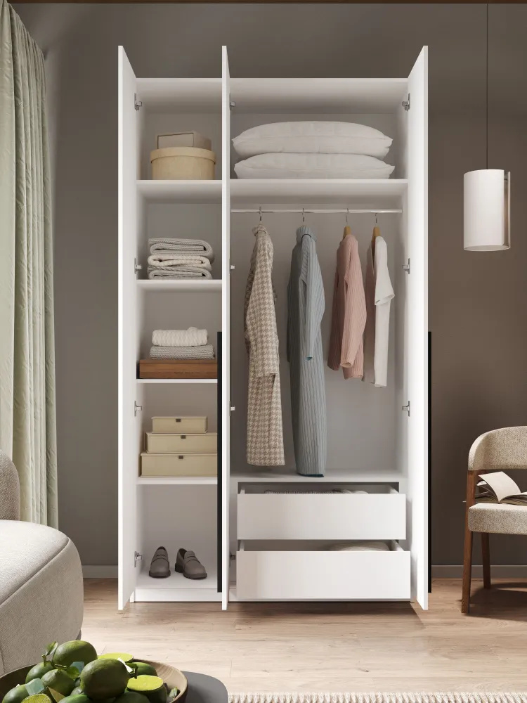 Внутри шкафа вы найдете полки и штангу для размещения вашей одежды. С встроенной тумбой и выдвижными ящиками, этот шкаф предлагает удобное хранение белья, аксессуаров и мелочей.