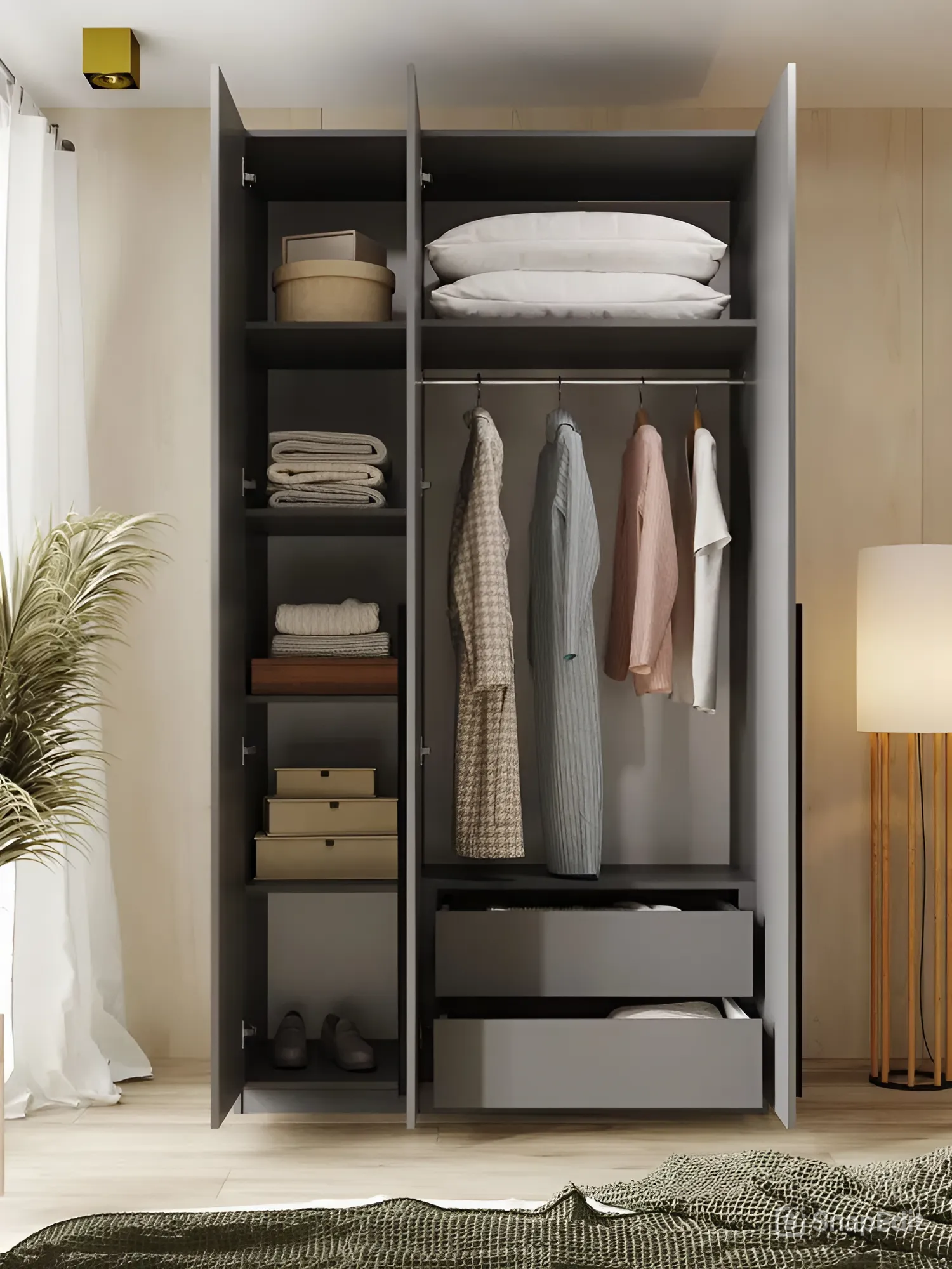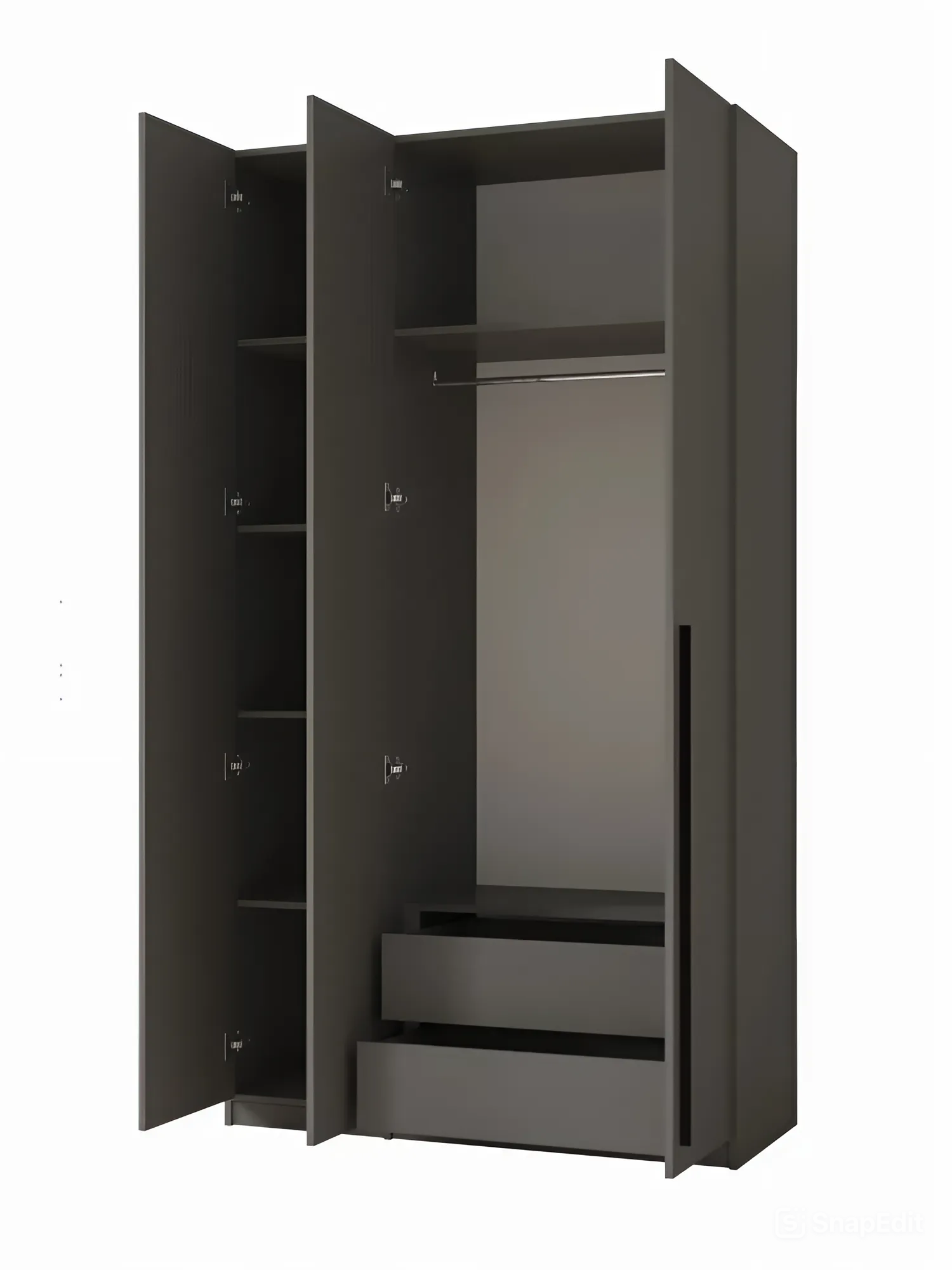 Внутри шкафа вы найдете полки и штангу для размещения вашей одежды. С встроенной тумбой и выдвижными ящиками, этот шкаф предлагает удобное хранение белья, аксессуаров и мелочей.