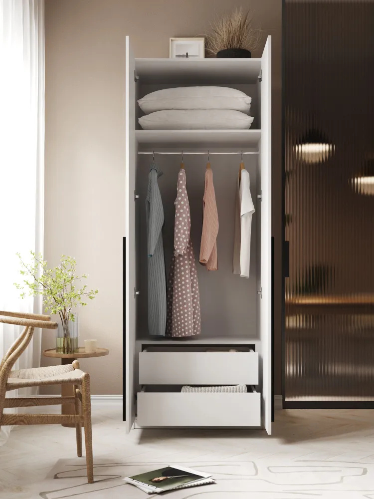 Данный шкаф сочетает в себе практичность и стиль. Удобная конструкция с двумя дверцами обеспечивает легкий доступ к одежде, а встроенные ящики позволяют удобно разместить мелкие предметы, такие как носки, ремни или платки. Благодаря распашному механизму, вам не придется беспокоиться о том, что двери будут мешать при открытии.