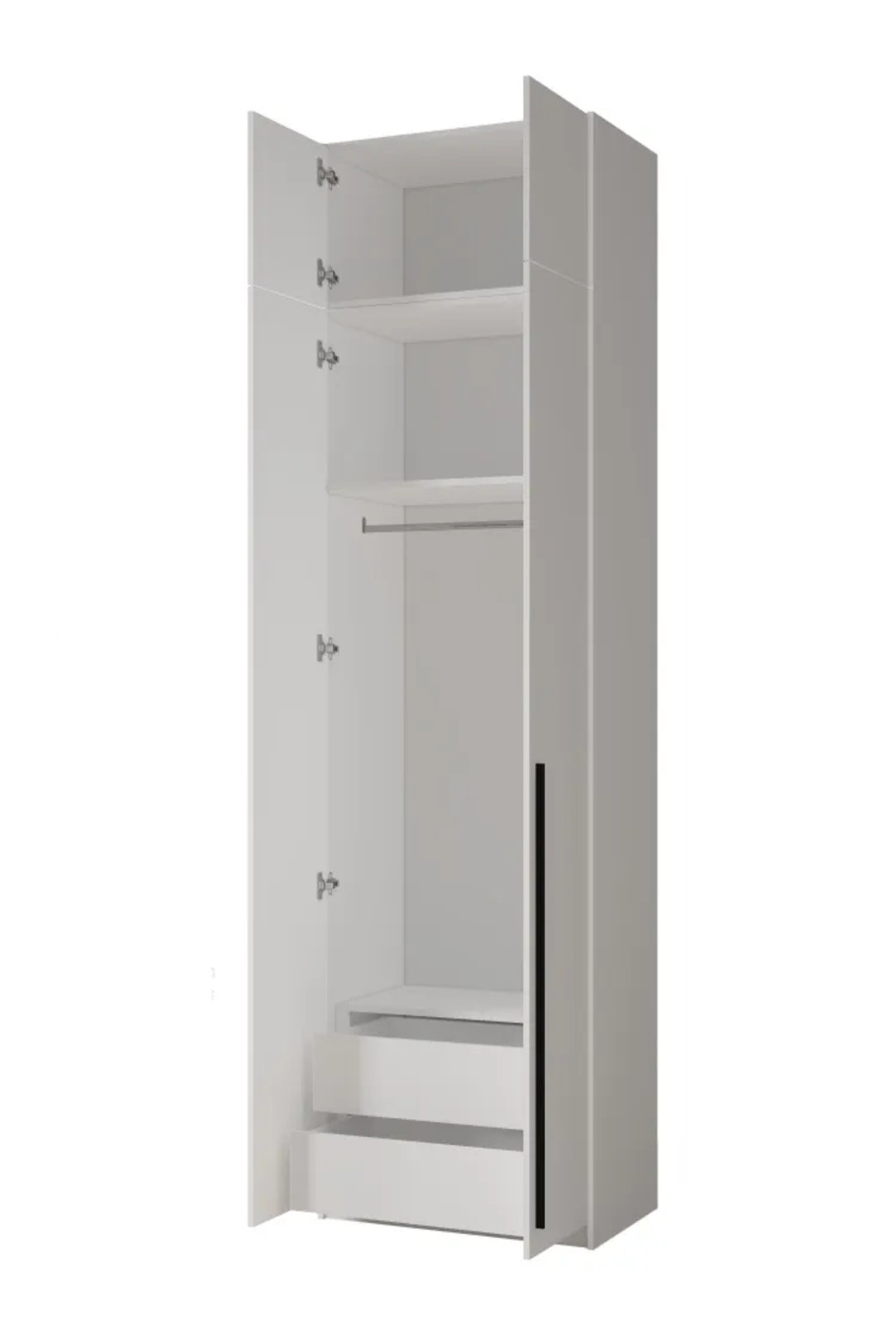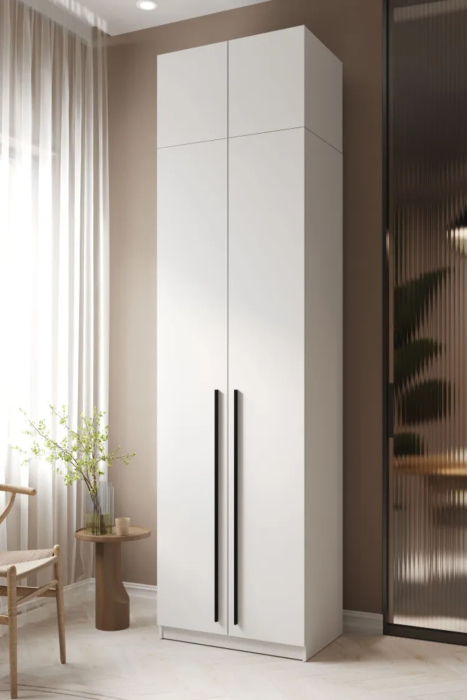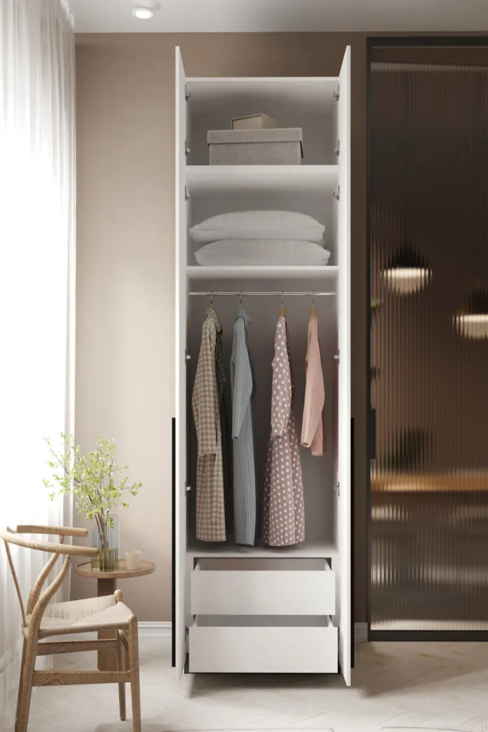 Шкаф обладает оптимальными размерами: 2600х800х500 мм, что делает его достаточно вместительным, но при этом не занимает много пространства. Его двухдверная конструкция обеспечивает лёгкий доступ к содержимому. Внутреннее пространство включает в себя множество полок и удобные ящики, предназначенные для хранения одежды, обуви и аксессуаров. Антресоль предлагает дополнительное место для сезонной одежды или предметов, которые вы не используете каждый день.