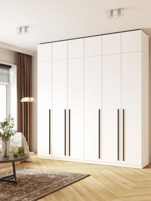 Размеры модели идеально подходят для размещения в больших комнатах, а объемное внутреннее пространство с множеством секций предлагает достаточно места для хранения как верхней одежды, так и деликатных вещей. Распашной механизм дверей позволяет легко открывать и закрывать шкаф, обеспечивая удобный доступ ко всем вашим гардеробным принадлежностям.