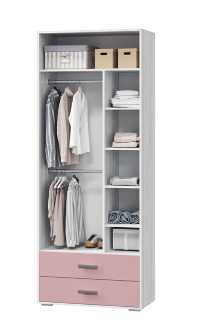 Двухдверный шкаф для одежды из коллекции Лило - универсальный вариант организации хранения в детской комнате девочки. Благодаря разноплановому наполнению модуля всем вещам маленькой принцессы хватит места. Продольные штанги пригодятся для одежды на плечиках, а комплект полок - для вещей в сложенном виде. Два вместительных ящика на шариковых направляющих Вы можете использовать для деликатных вещей, постельного белья и аксессуаров.