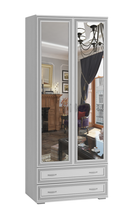 Двустворчатый шкаф для одежды и белья Ливорно. Оснащен штангой и двумя выдвижными ящиками в нижней части. Зеркальные двери способны создать комфортную обстановку для организации гардеробной части. Материал фасада:Рамочный профиль из МДФ, 3D-вставка из МДФ.Материал корпуса:ЛДСП.Установлены петли с доводчиками для бесшумного закрывания и шариковые направляющие полного выдвижения.Фурнитура:«Старая бронза» 96 мм.