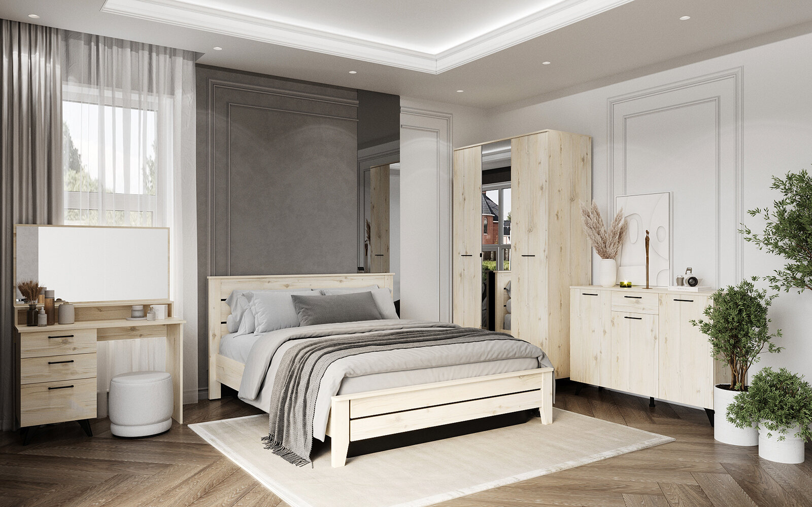 Грамотно организовать хранение в спальне, используя при этом минимум пространства, поможет трехстворчатый шкафиз коллекции Sofia с зеркальным фасадом. Модель оснащена набором полок для хранения коробок и вещей в сложенном виде и продольной штангой для деликатной одежды на плечиках. Несмотря на габариты, шкаф не кажется массивным: зеркало визуально облегчает его конструкцию, а тонкие черные ножки приподнимают над полом.