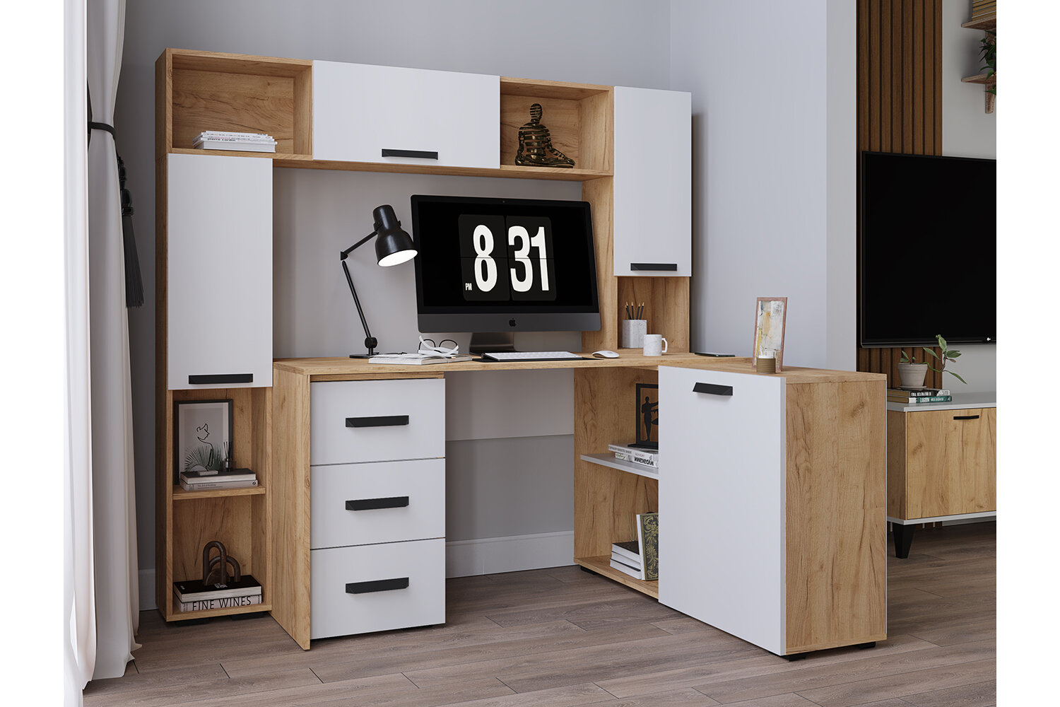 Модульную серию Квартет-13 можно использовать для создания мини-офиса или компактного рабочего места. Эффектный корпус в древесном декоре отлично сочетается с фасадами в цвете графит и в белом цвете с тиснением "древесные поры".