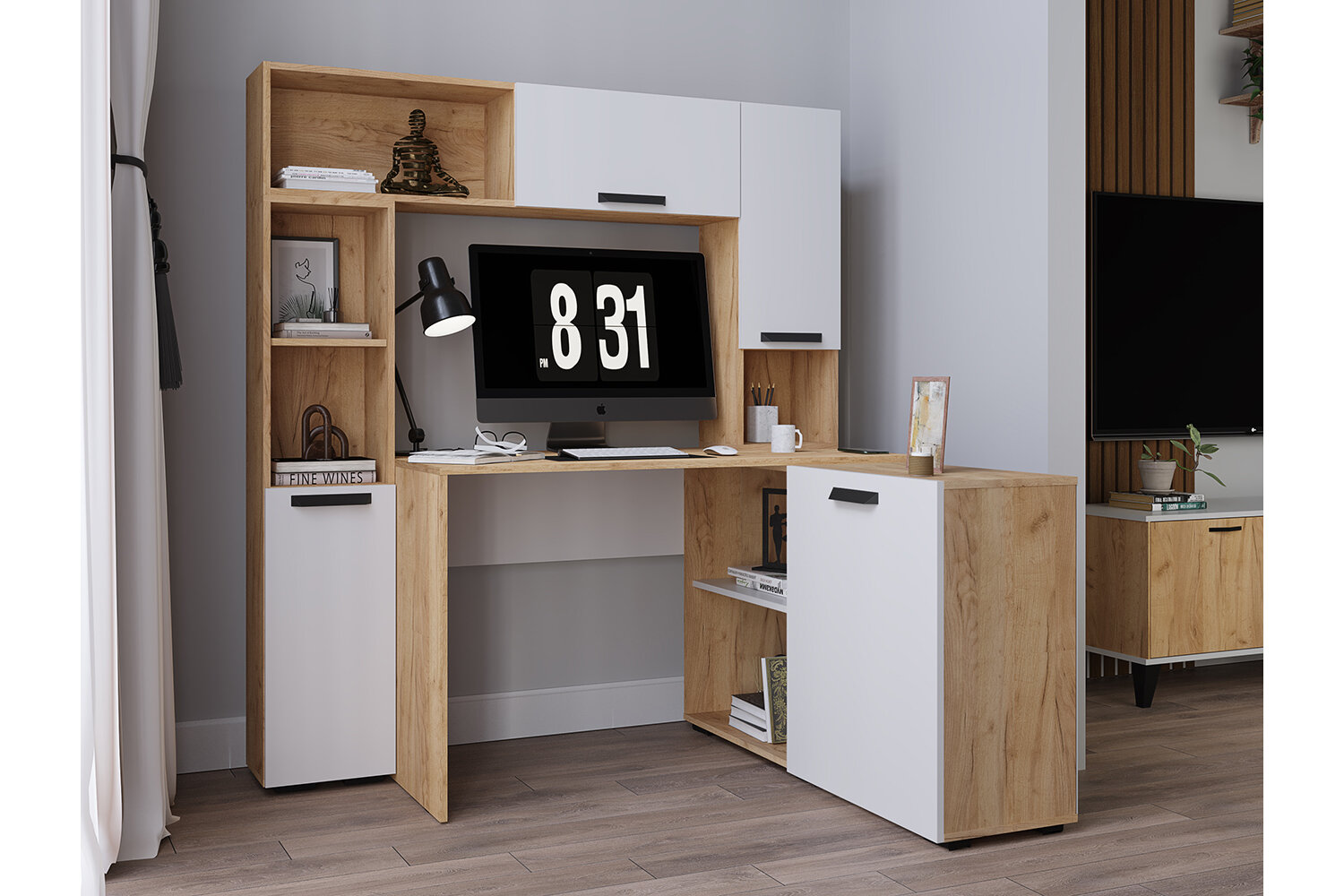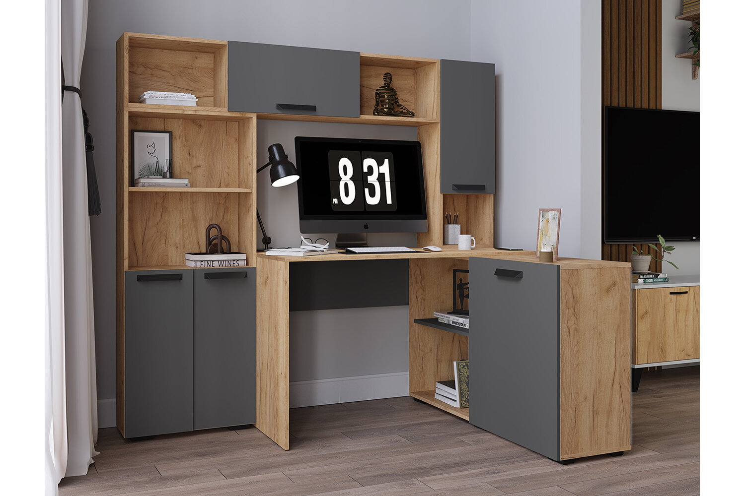 Модульную серию Квартет-13 можно использовать для создания мини-офиса или компактного рабочего места. Эффектный корпус в древесном декоре отлично сочетается с фасадами в цвете графит и в белом цвете с тиснением "древесные поры".