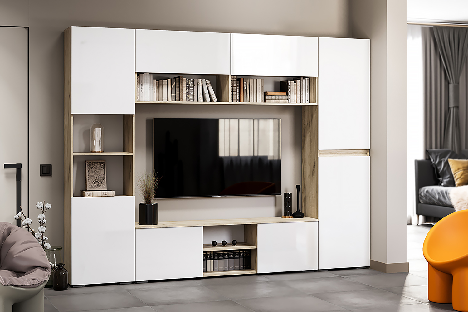 Шкаф-пенал с открытыми полками из коллекции Вирола дополнит Вашу гостиную. Белые глянцевые фасады отлично сочетаются с корпусом в древесных оттенках.