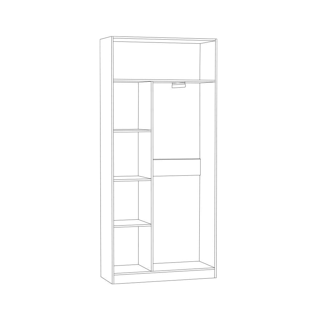 Шкаф состоит из трёх секций: первая предназначена для хранения белья с тремя полками, вторая — для одежды на вешалках со штангой, а третья — для головных уборов.