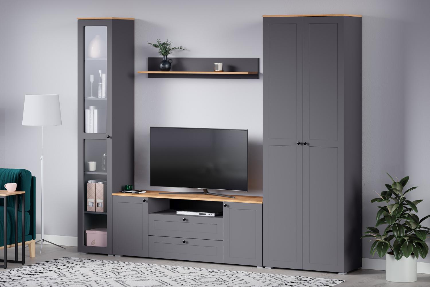 Остин — это современная классическая гостиная, отличающаяся лаконичностью, строгими линиями и контрастной фурнитурой. Она сочетает в себе функциональность и элегантность. Коллекция доступна в двух цветах: белом и графитовом с тёплым древесным декором.