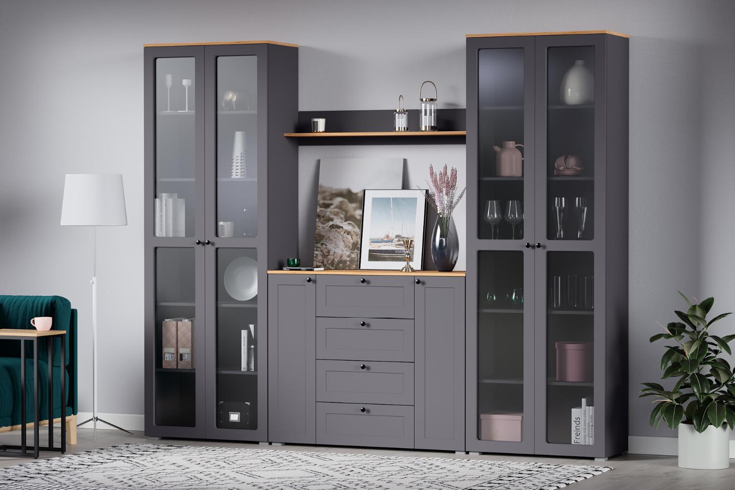 Остин — это современная классическая гостиная, отличающаяся лаконичностью, строгими линиями и контрастной фурнитурой. Она сочетает в себе функциональность и элегантность. Коллекция доступна в двух цветах: белом и графитовом с тёплым древесным декором.