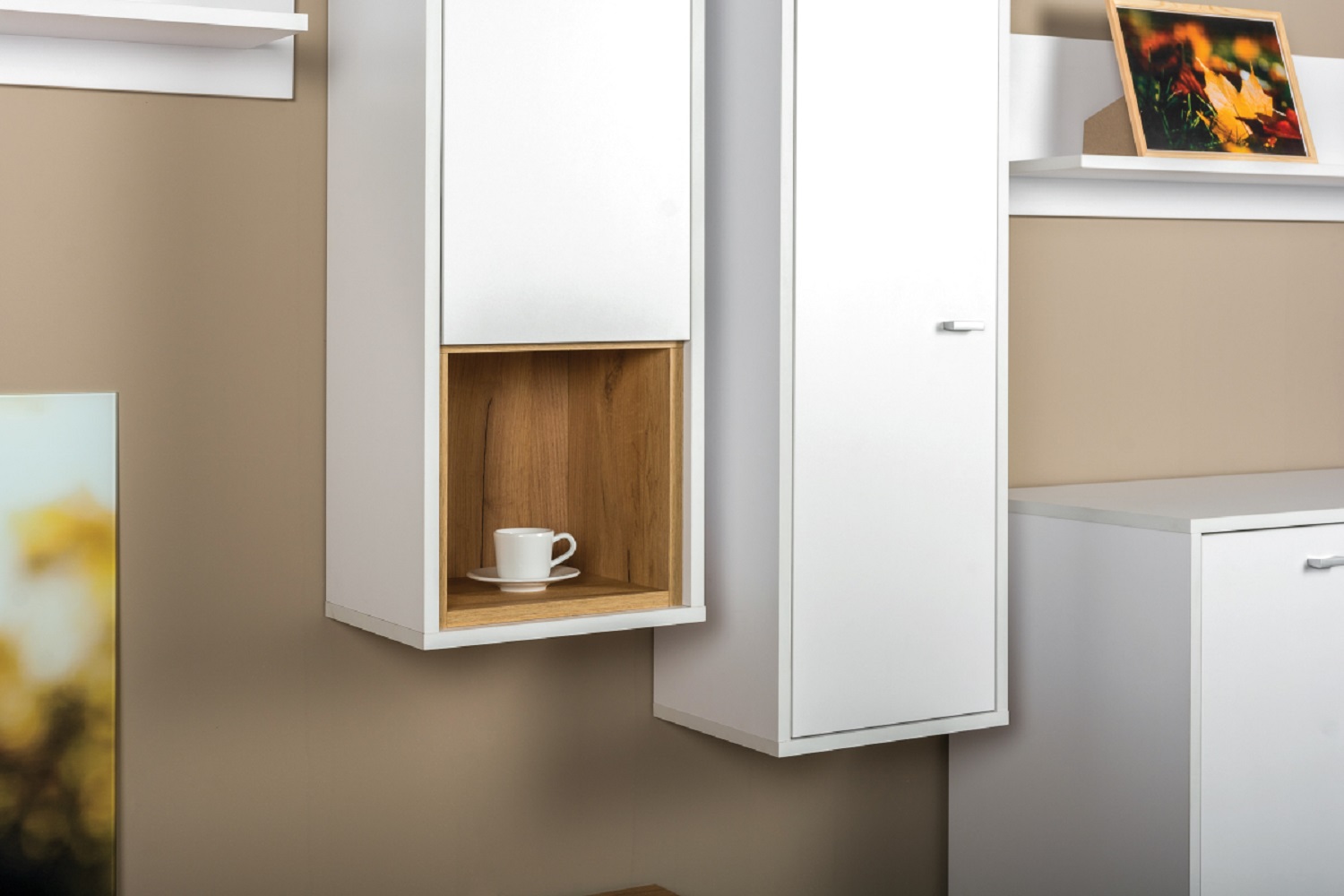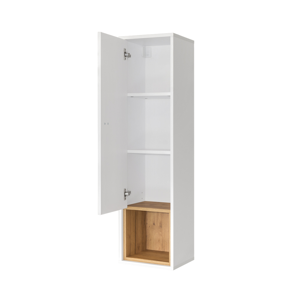 Навесной шкаф Бэль с фасадами из глянцевого ЛДСП в цвете «белый премиум» и корпусом в цвете «дуб крафт золотой» — это стильный и функциональный предмет мебели. Он оснащён открытыми полками, что обеспечивает удобное хранение различных предметов. Ручки шкафа выполнены из ABS-пластика
