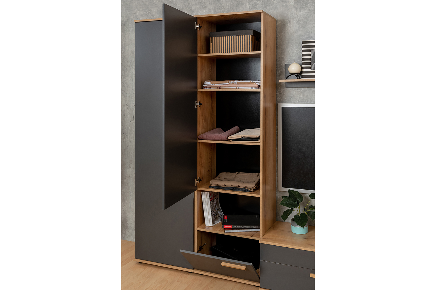 Шкаф 11 Crown - универсальный предмет мебели в гостиной. В комплект входит набор полок, на которых Вы с комфортом разместите все вещи, которые лучше спрятать от лишних глаз: книги, коробки с мелочовкой, ценности. Нижний фасад откидной и имеет кронштейн-ограничитель. Благодаря регулируемым опорам Вы можете компенсировать незначительные неровности пола. Модуль собирается на левую или правую сторону.