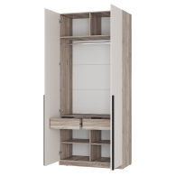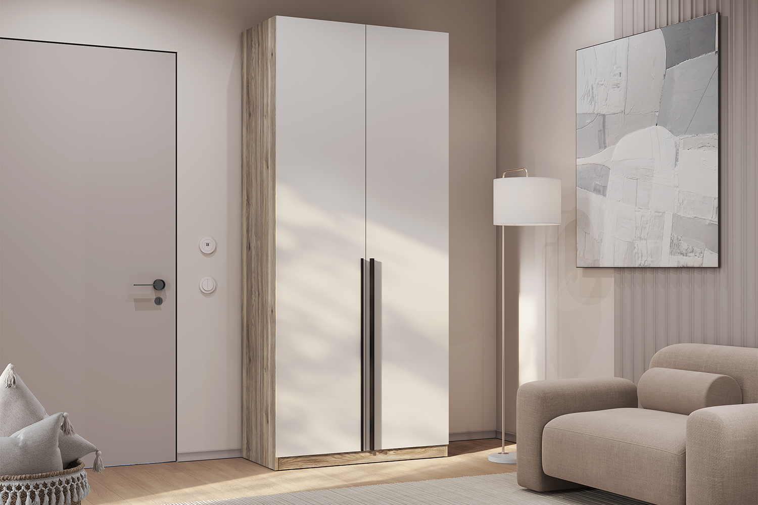 Внутреннее наполнение шкафа продумано до мелочей, создавая идеальные условия для хранения ваших вещей. На полках вы сможете удобно разместить различные предметы: от аккуратно сложенных свитеров и постельного белья до книг и аксессуаров. А стационарная штанга позволит вам с лёгкостью повесить любимую одежду, включая платья, рубашки и жакеты, обеспечивая им идеальный вид и доступность.