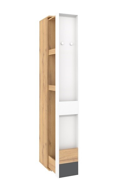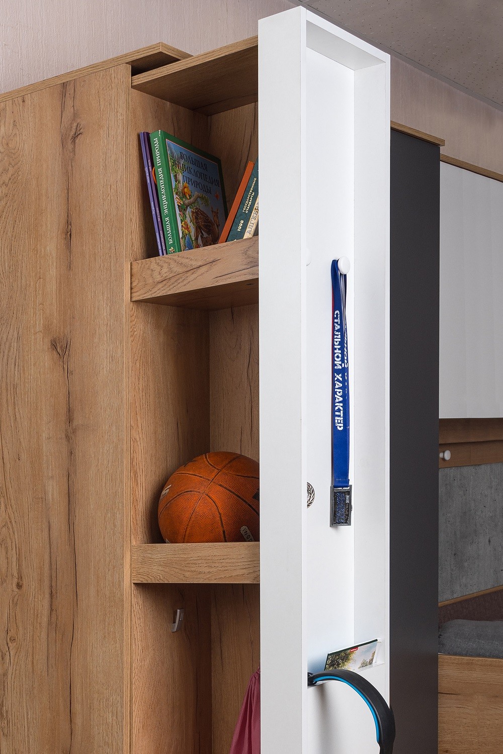 Часто увлечения и хобби ребенка перерастает в дело всей жизни. Выдвижной шкаф МЦН имеет две зоны хранения: закрытую зону и открытую с карманами. Наполнение шкафа, комплект полок с ограничителями и ниша с крючками, идеально подойдет для хранения вещей в сложенном виде. Канцелярские предметы, книги и предметы декора Вы сможете расположить на самом фасаде.