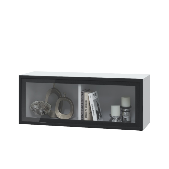 Шкаф навесной горизонтальный со стеклом - отличный вариант для хранения книг, аксессуаров и памятных статуэток в гостиной.