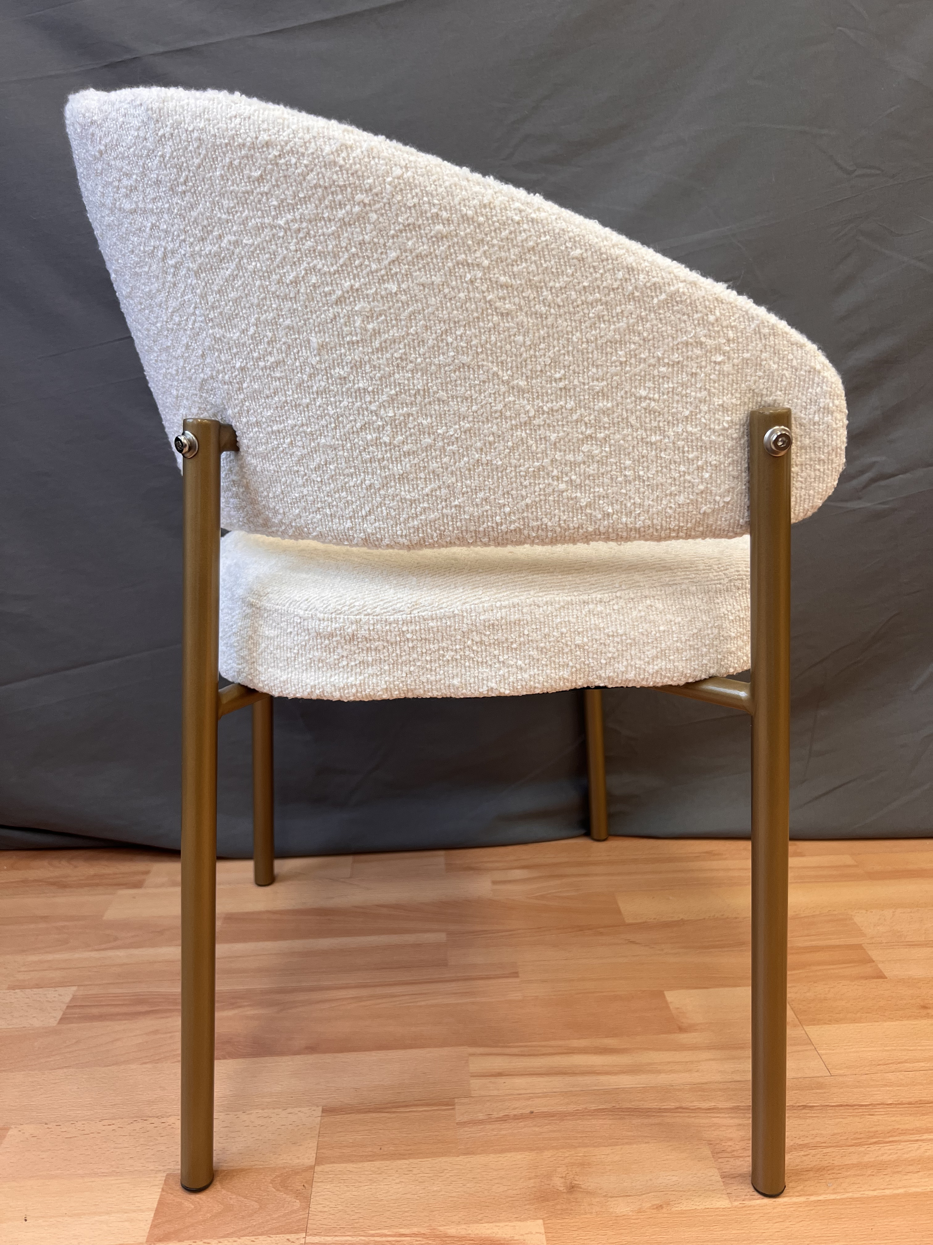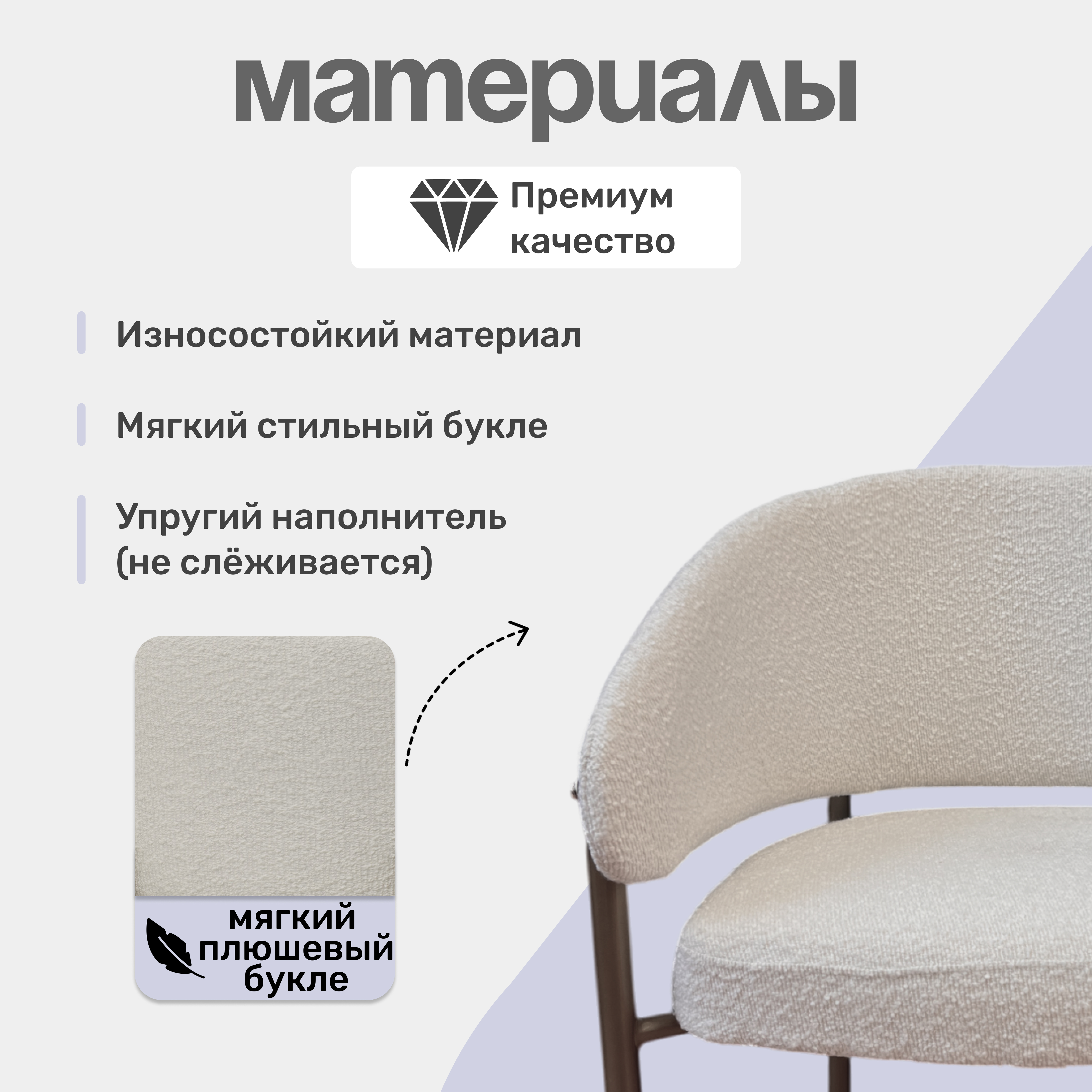 Кресло выполнено в бежевом цвете с золотистыми акцентами, что придает ему изысканный и современный вид. Обивка из букле, обеспечивает мягкость и комфорт при использовании.