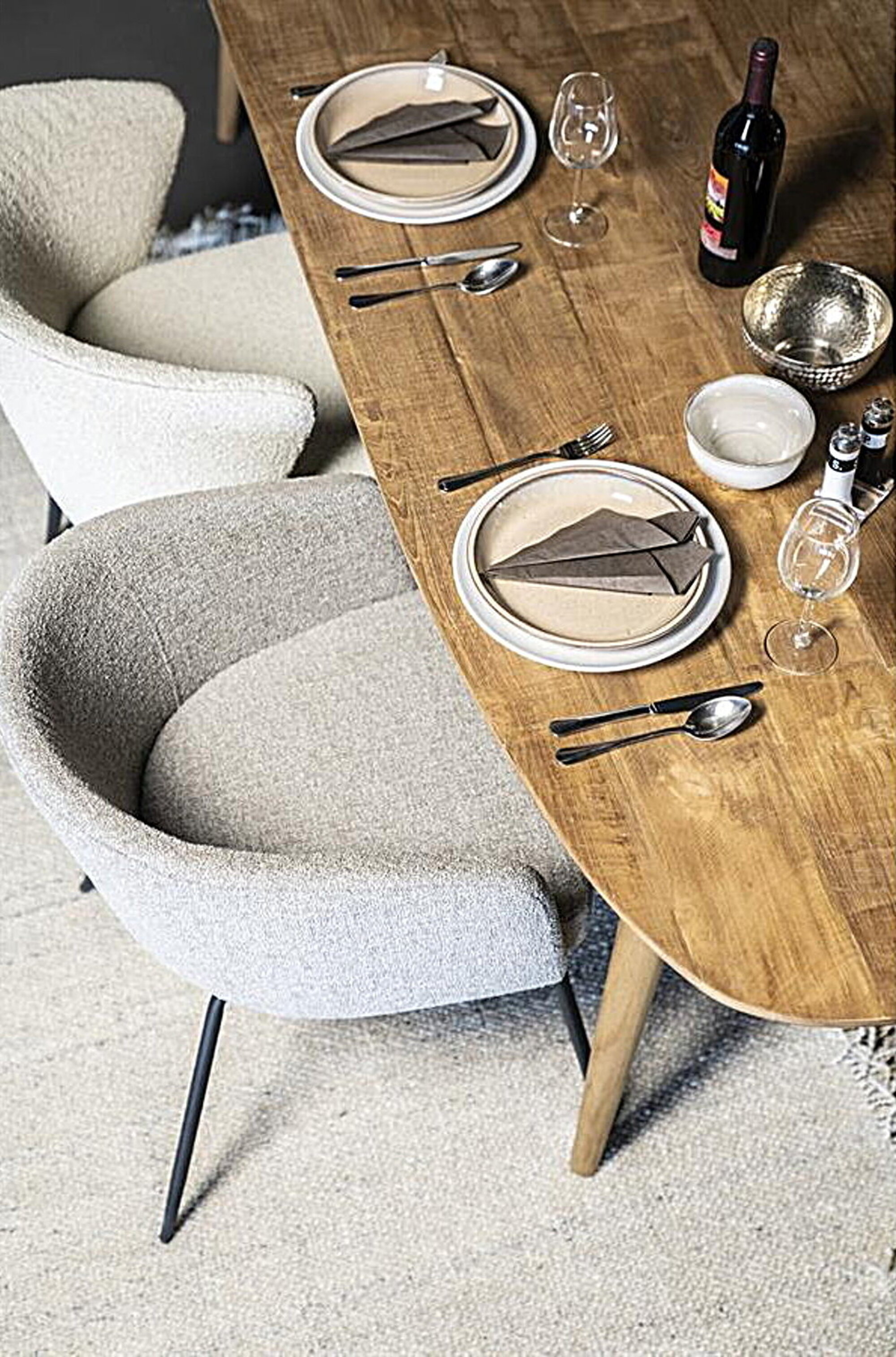 Обивка стула выполнена из высококачественного букле белого цвета, который не только придаёт стулу изысканный вид, но и обеспечивает комфорт и тепло при использовании. Ножки стула из прочного черного металла гарантируют надежность и стабильность, создавая великолепный контраст с мягкой обивкой.