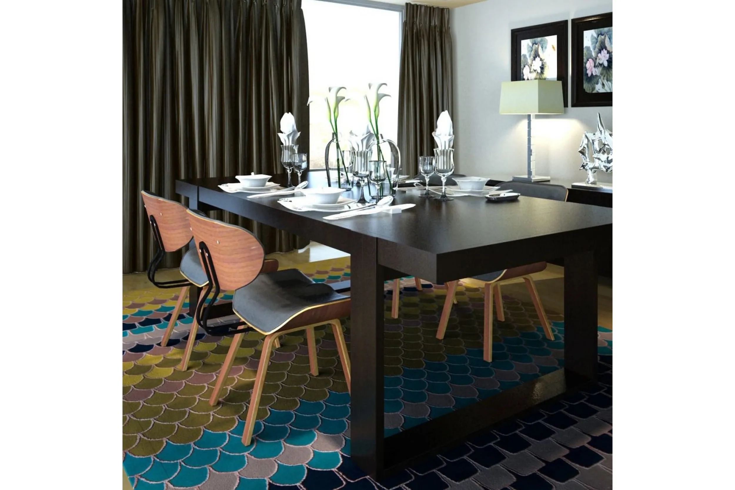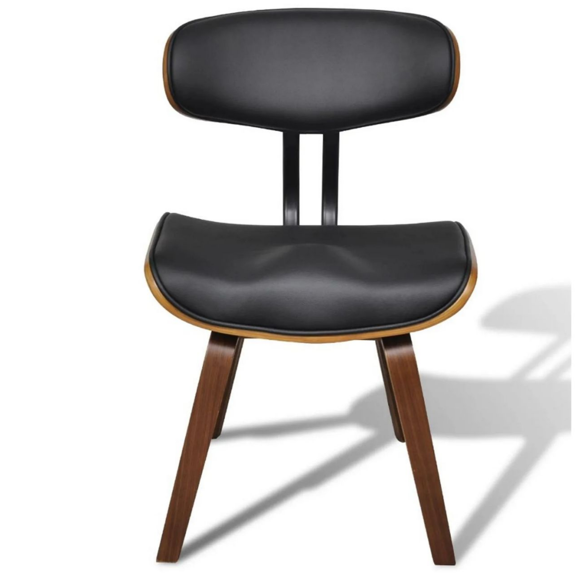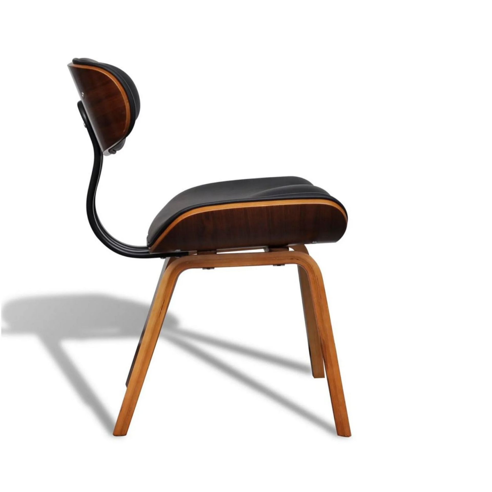 Стул выполнен в минималистичном стиле с акцентом на изысканные детали. Основание и ножки изготовлены из тонированной гнутой фанеры, что придает модели легкость и изящество. Коричневый цвет основания гармонично сочетается с черной обивкой из искусственной кожи, создавая контрастный и стильный образ.