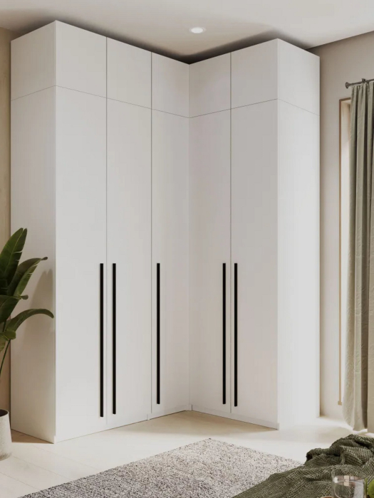 Конструкция этого распашного шкафа включает два двери и практичные ящики, которые позволят удобно хранить одежду, обувь и аксессуары. Угловой шкаф обеспечивает максимальный доступ к хранению вещей, что делает его функциональным и удобным.