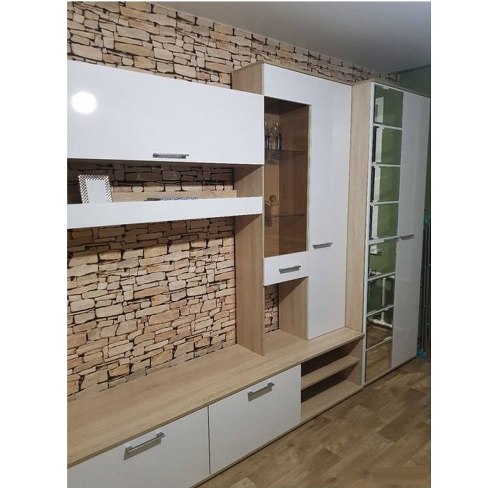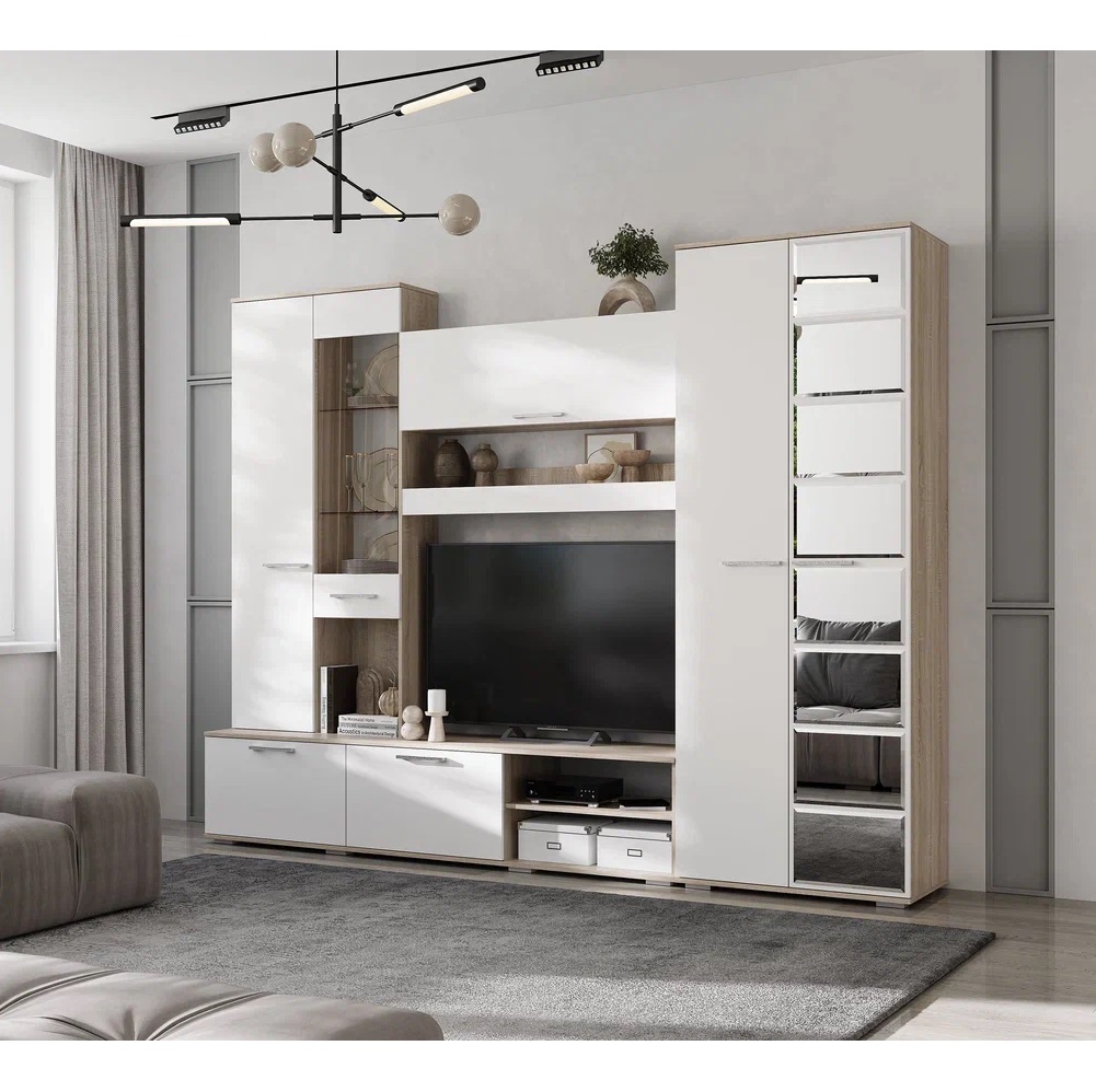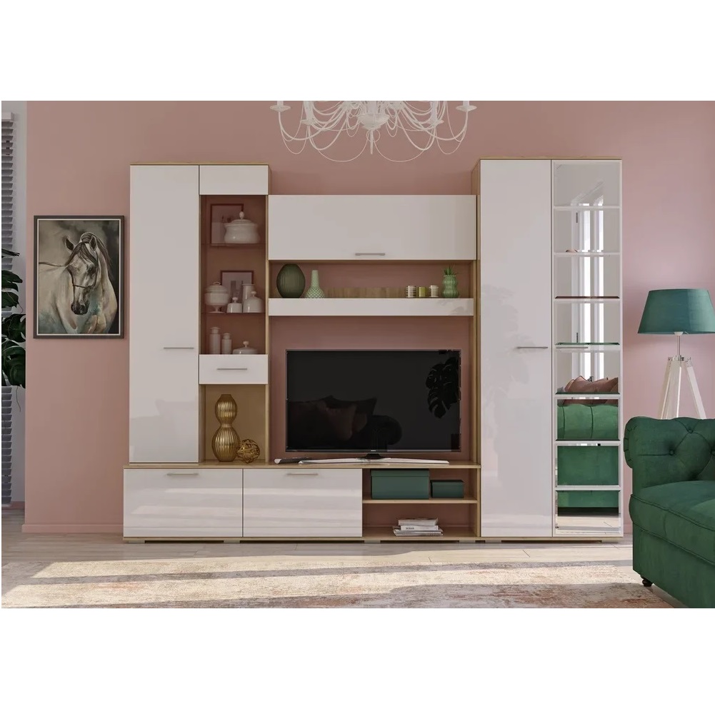 Центральная секция Флай представляет собой полноценную систему хранения и место для организации ТВ-зоны в гостиной. Габариты модуля позволяют организовать пространство комнаты максимально продуманно. Места хватит для телевизора диагональю до 42" и сопутствующей техники, сервиза и предметов декора, книг, коробок с вещами и всего того, что необходимо Вам в гостиной. Модуль выполнен в современном стиле в декоре дуб сонома/белый. Стеклянные створки визуально облегчают конструкцию секции и декорируют интерьер. За счет универсальной сборки Вы можете собрать ее как на левую, так и на правую сторону.