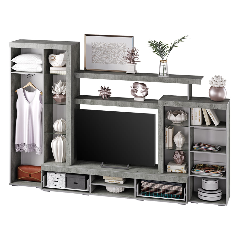 Инстайл Секция центральная ЦС-02 в цвете бетон/белый — это функциональная и стильная мебель для гостиной или спальни. Она состоит из пяти полок из ЛДСП, пяти стеклянных полок, штанги, двух выкатных ящиков и двух декоративных полок с МДФ-панелями. Размеры секции: длина — 304 см, глубина — 46 см, высота — 198,4 см.