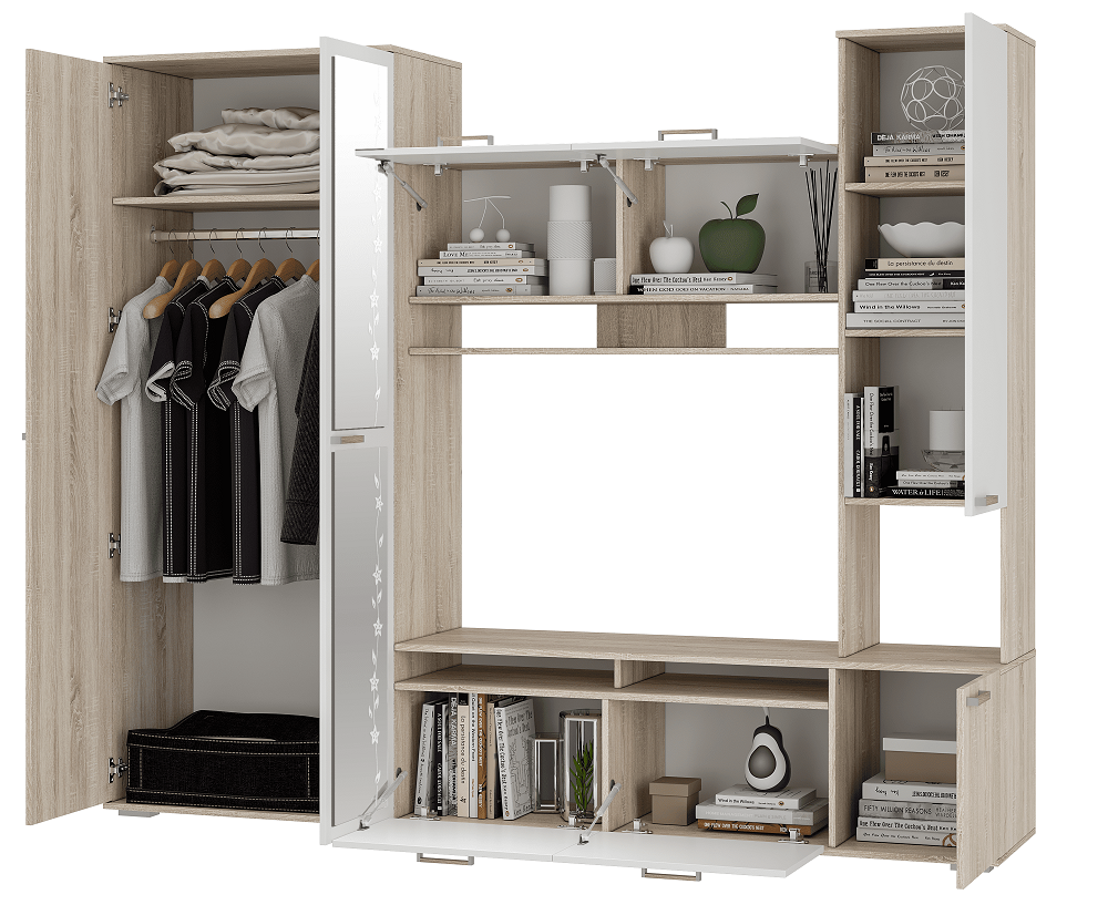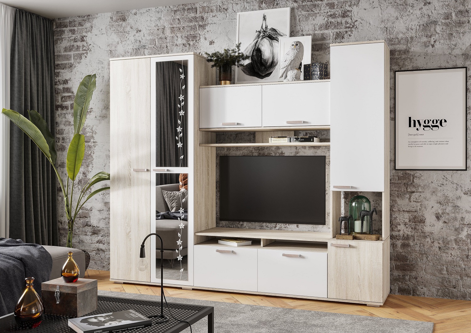 Благодаря контрастному сочетанию фасадов белого цвета с древесной фактурой дуба «сонома», эта гостиная станет ярким акцентом в любом интерьере. Отделка зеркалами добавит изысканности и света в помещение.