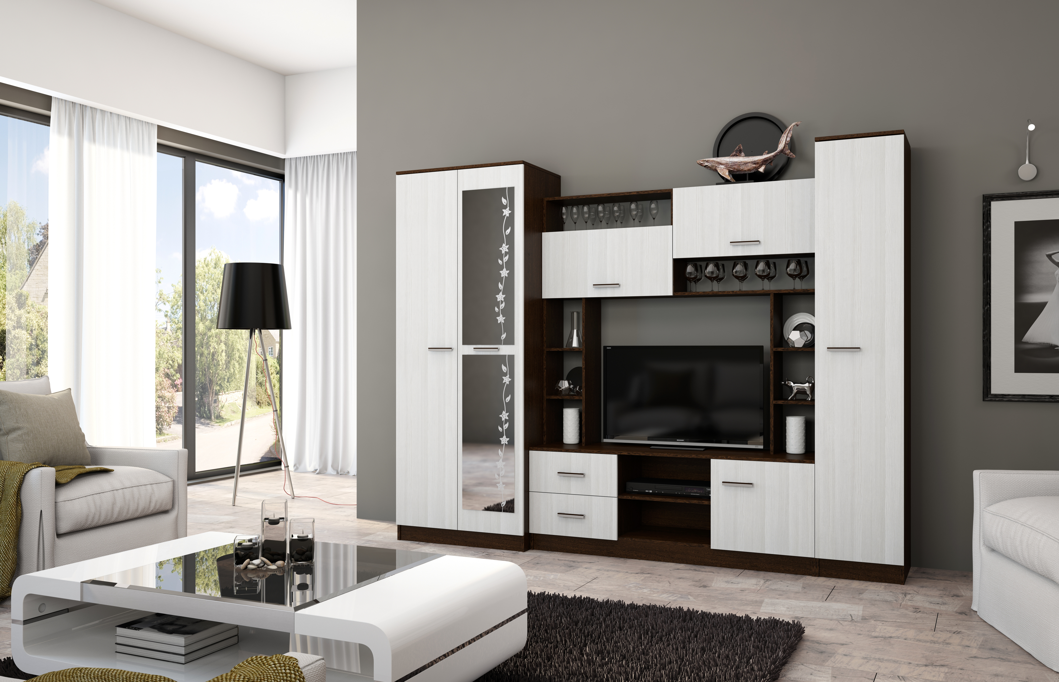 Гостиная Рига ГС-01 — это стильная и функциональная мебель для вашего дома. Строгий дизайн гостиной дополняют нестандартные детали, такие как полки-аквариумы из прозрачного стекла. Они служат для размещения красивых элементов декора или небольших светильников, создавая уют в вашем доме.
