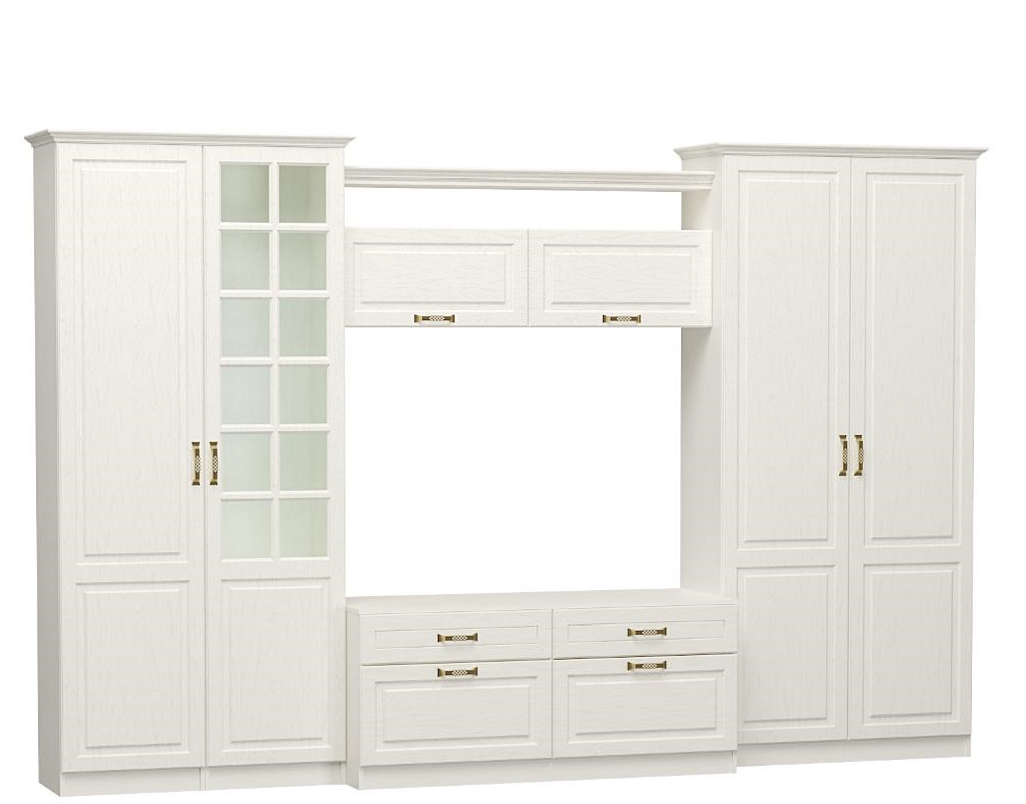 Лицевая фурнитура выполнена в виде металлических ручек с имитацией под старую бронзу, что придаёт шкафу изысканный и стильный вид.