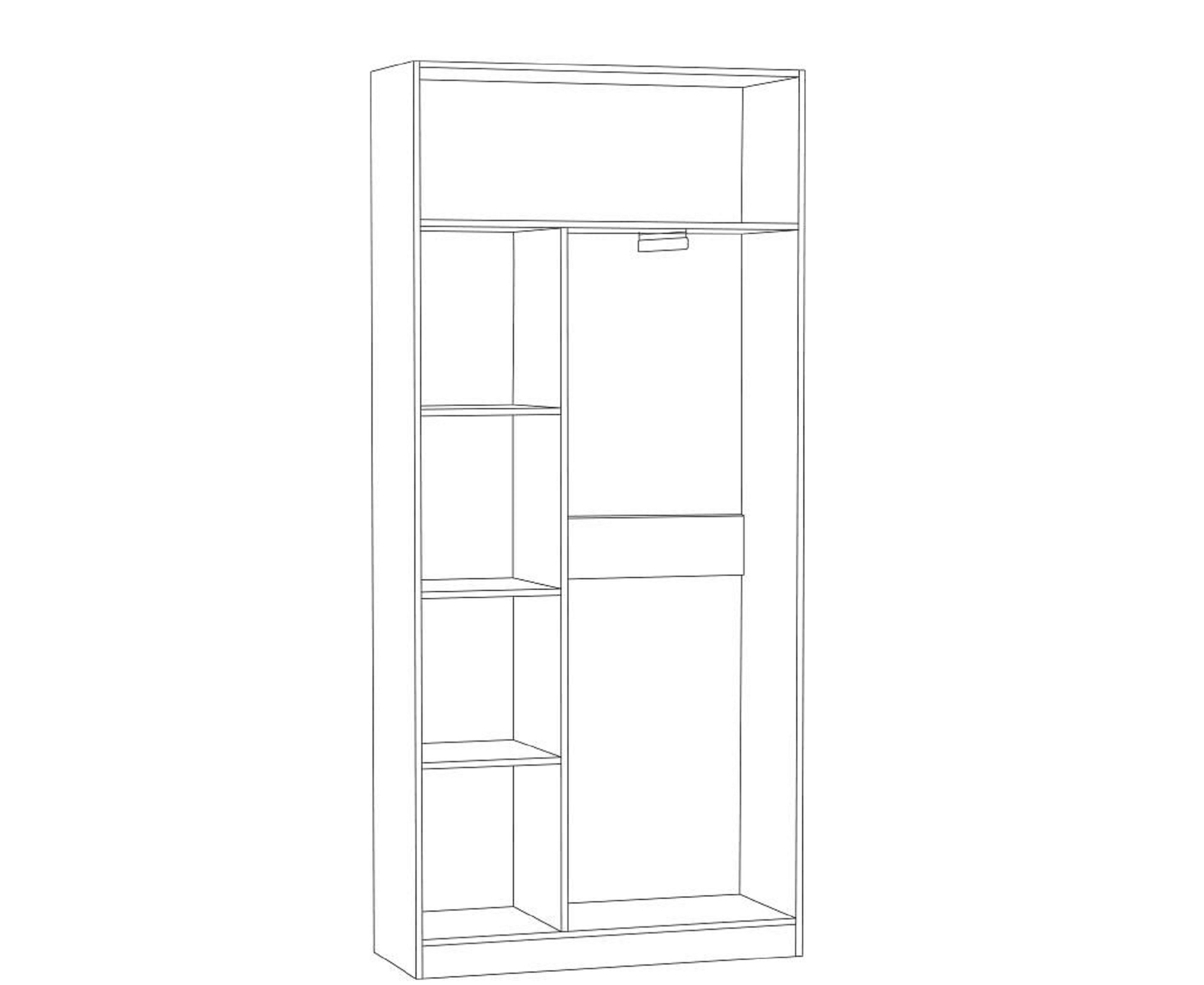 Шкаф состоит из трёх секций: первая предназначена для хранения белья с тремя полками, вторая — для одежды на вешалках со штангой, а третья — для головных уборов.