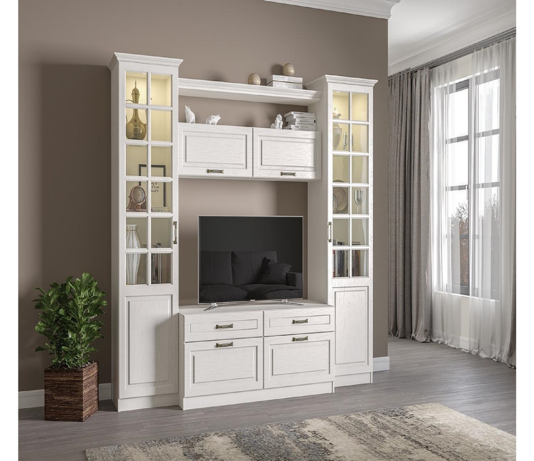 «Ливерпуль» станет прекрасным дополнением интерьера гостиной. Комбинированный фасад с прозрачными стеклянными вставками и изящной ручкой цвета античной бронзы добавит изысканности и шарма. Полки станут отличным местом для хранения посуды, сувениров и других предметов декора, создавая уют и индивидуальность помещения. Особую привлекательность шкафу придаёт встроенная подсветка.