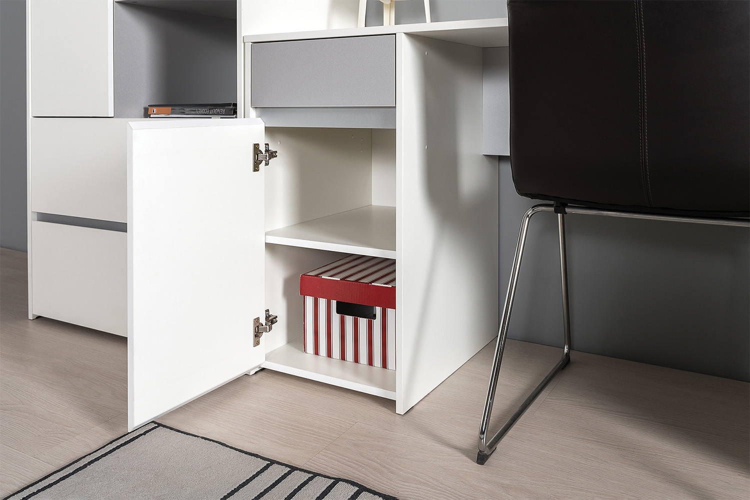 Базовый белый цвет, сочетаясь с акцентным серым, создаёт нейтральную основу интерьера, чтобы подчеркнуть личные вещи и аксессуары.