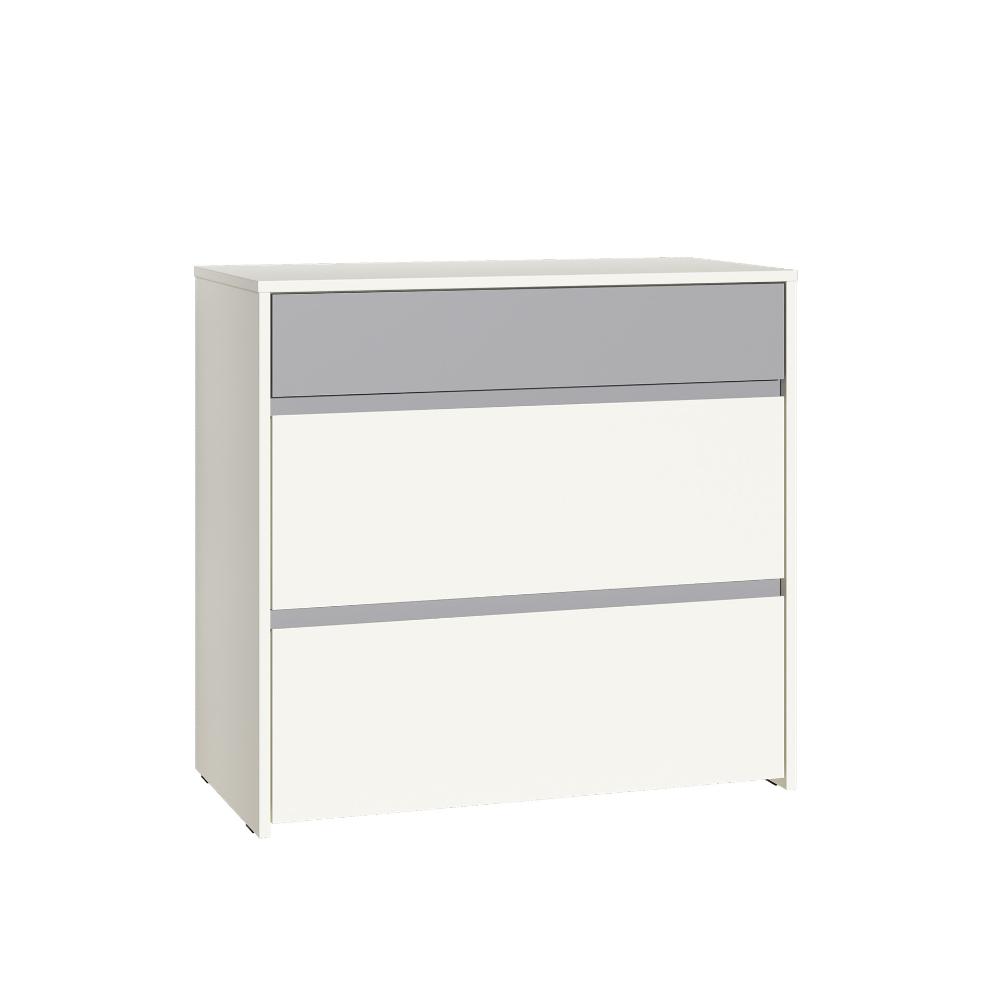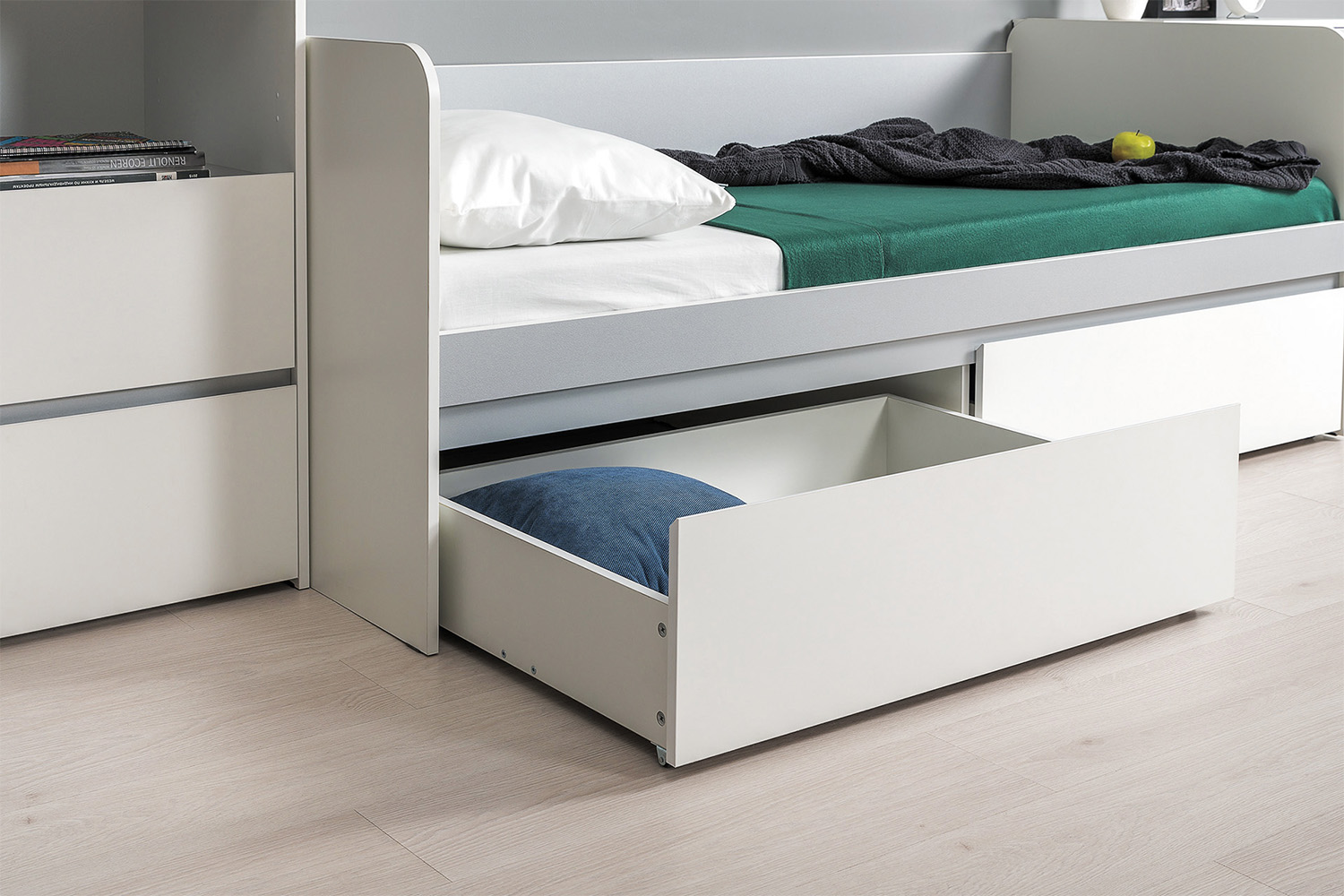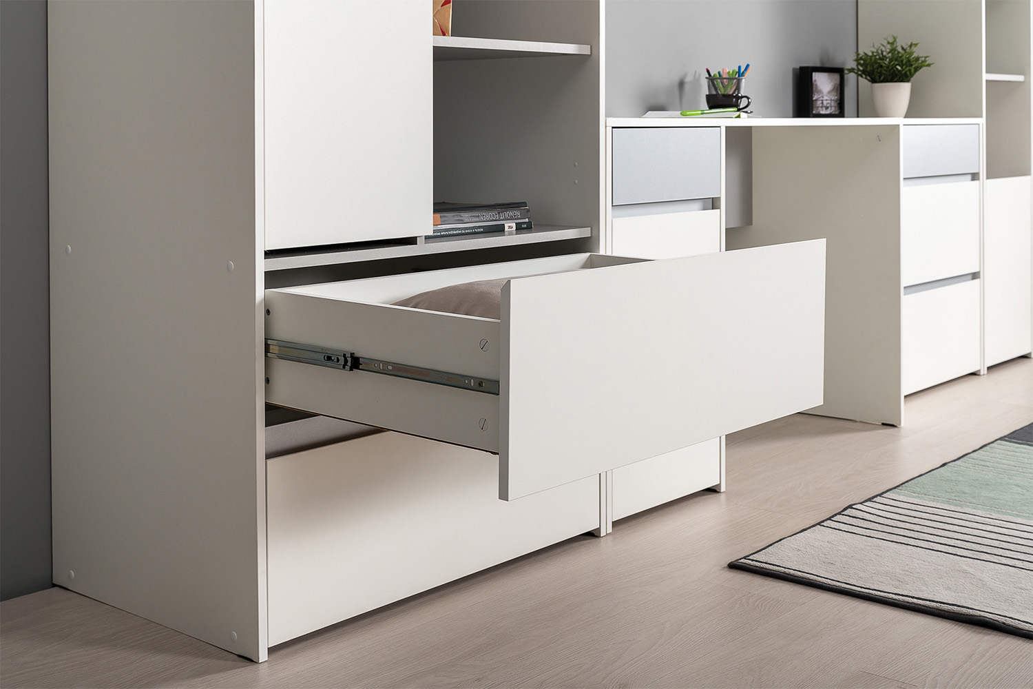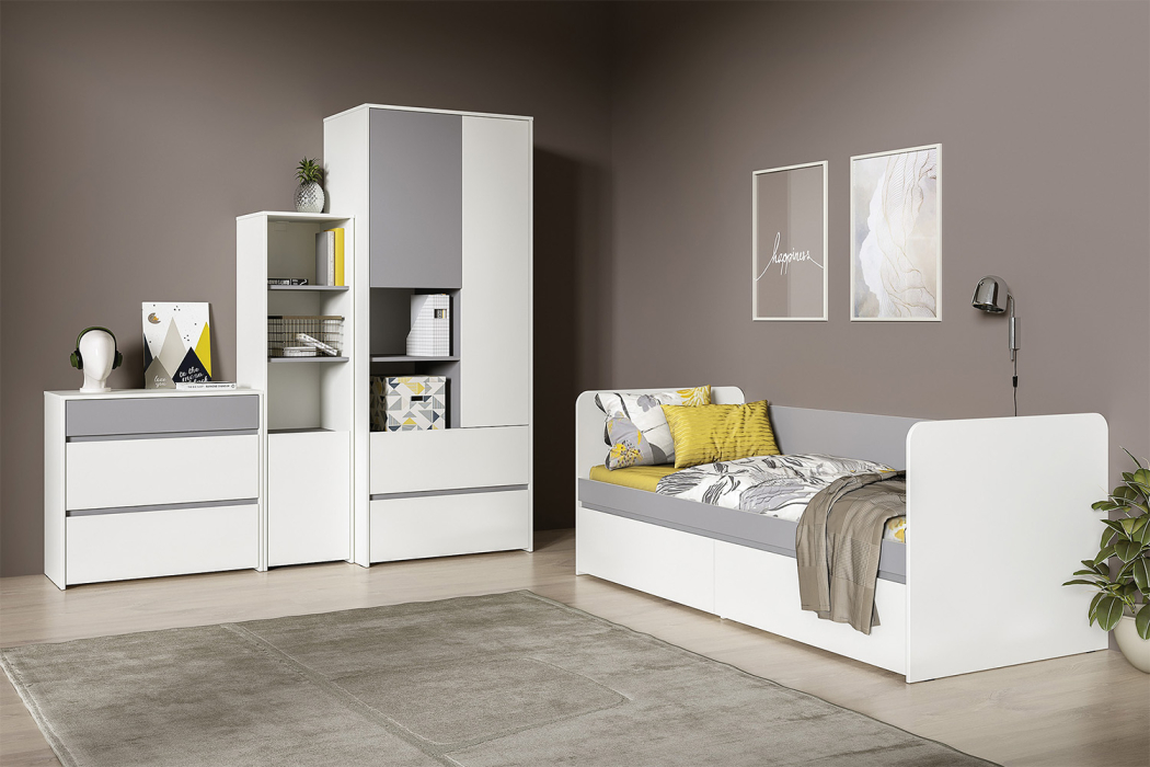 Стильная и актуальная мебель для молодёжной комнаты. Базовый белый цвет, сочетаясь с акцентным серым, создаёт нейтральную основу интерьера, чтобы подчеркнуть личные вещи и аксессуары.