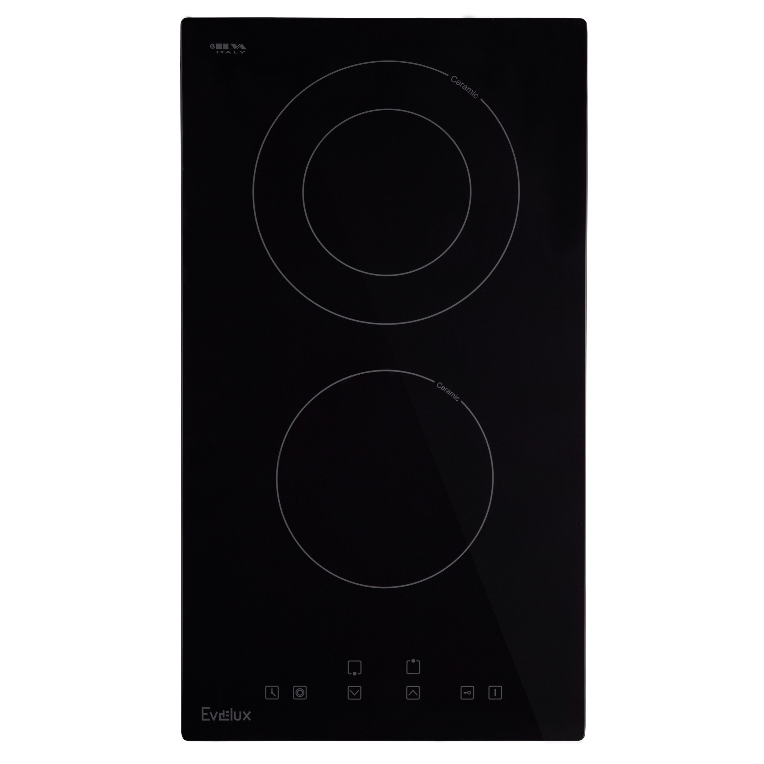 Варочная панель электрическая, стеклокерамика, Hi Light,30 см,2 конфорки,сенсорное управление, 9 уровней мощности,таймер 1-99 мин,блокировка управления, защитное отключение, защита детей,двухконтурная, 3200 Вт, вилка питания, черное стекло ILVA (Италия), 290мм x 520мм x 50мм.
