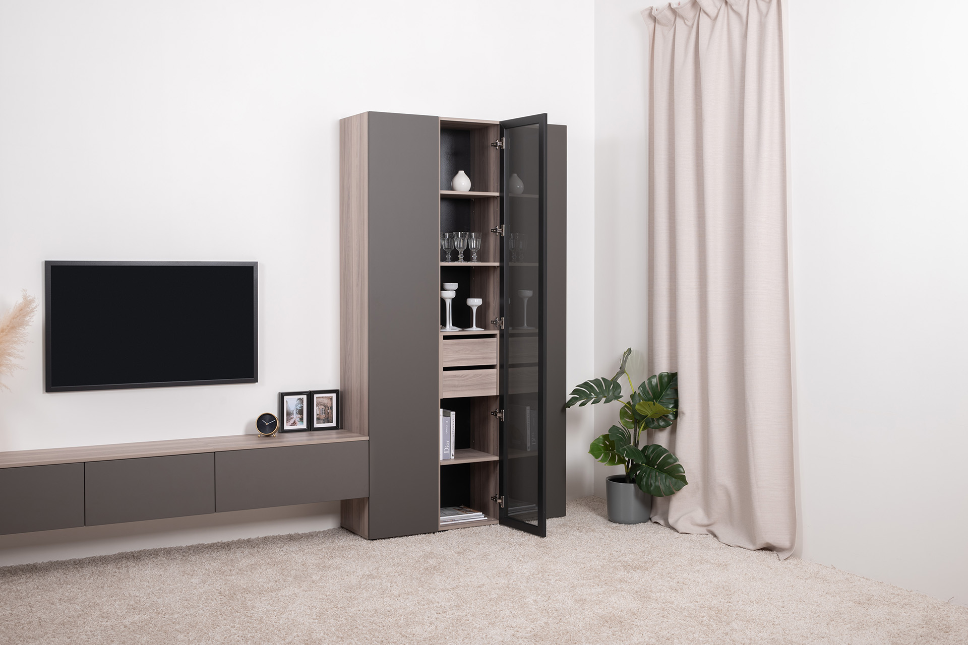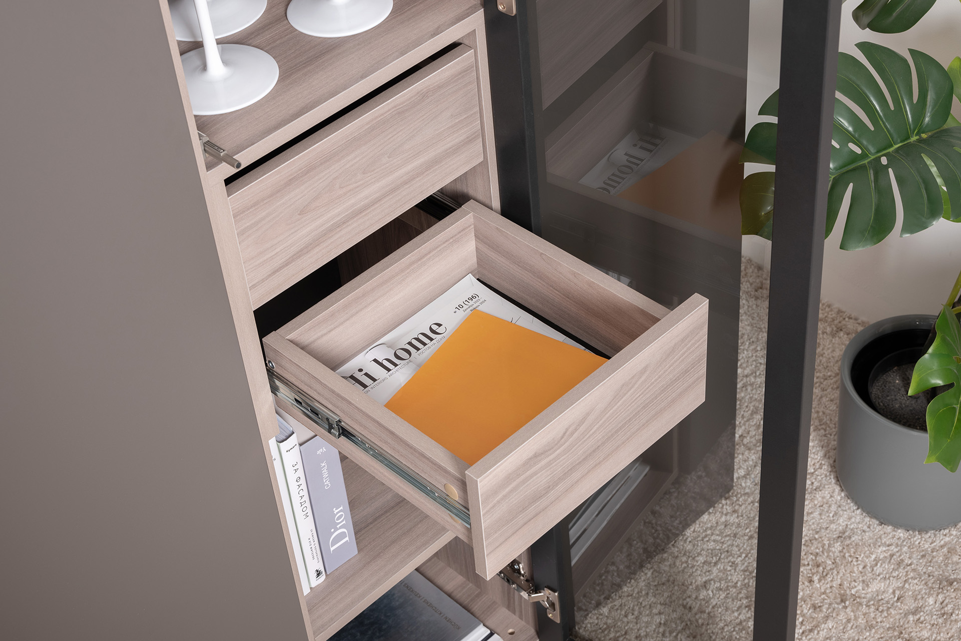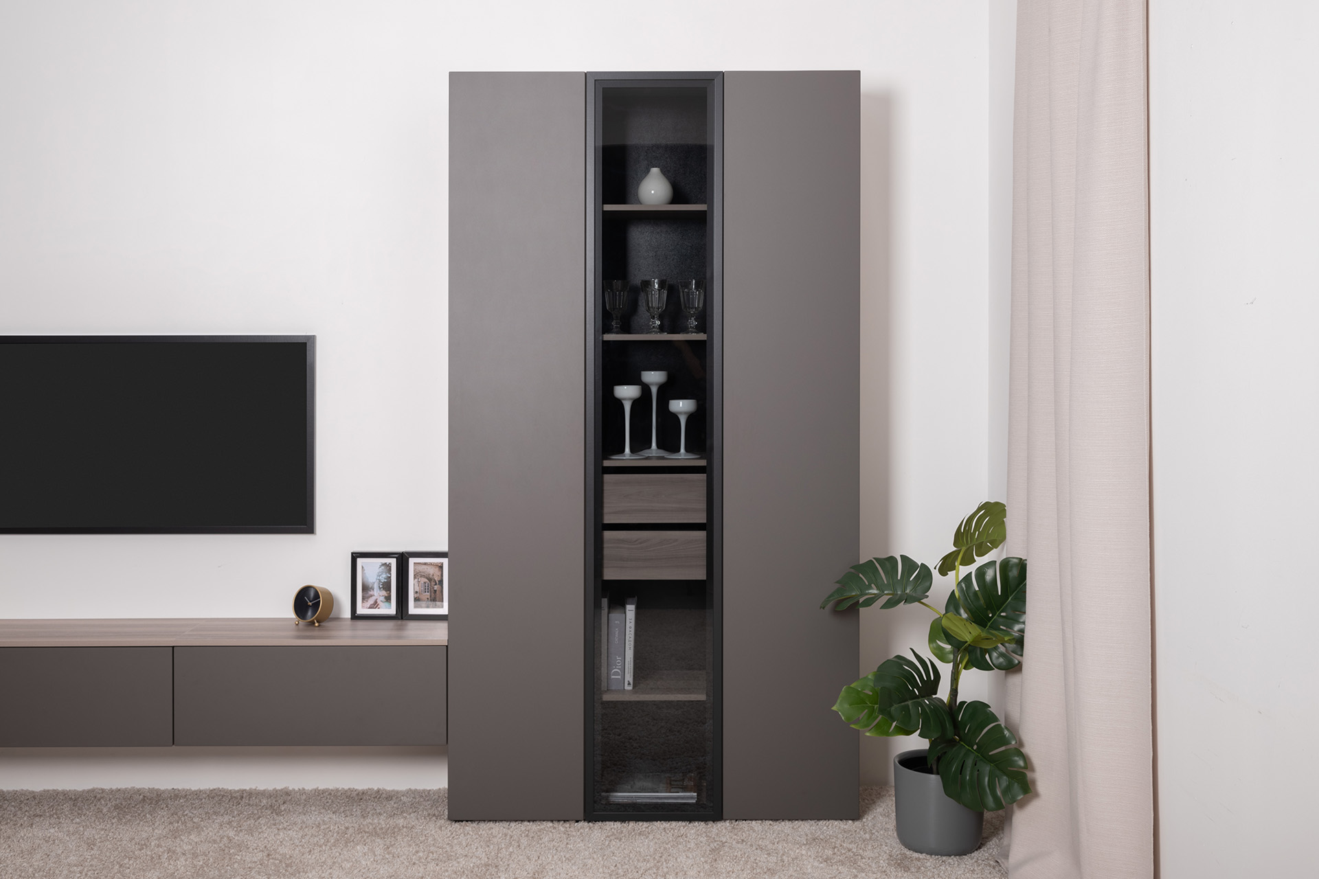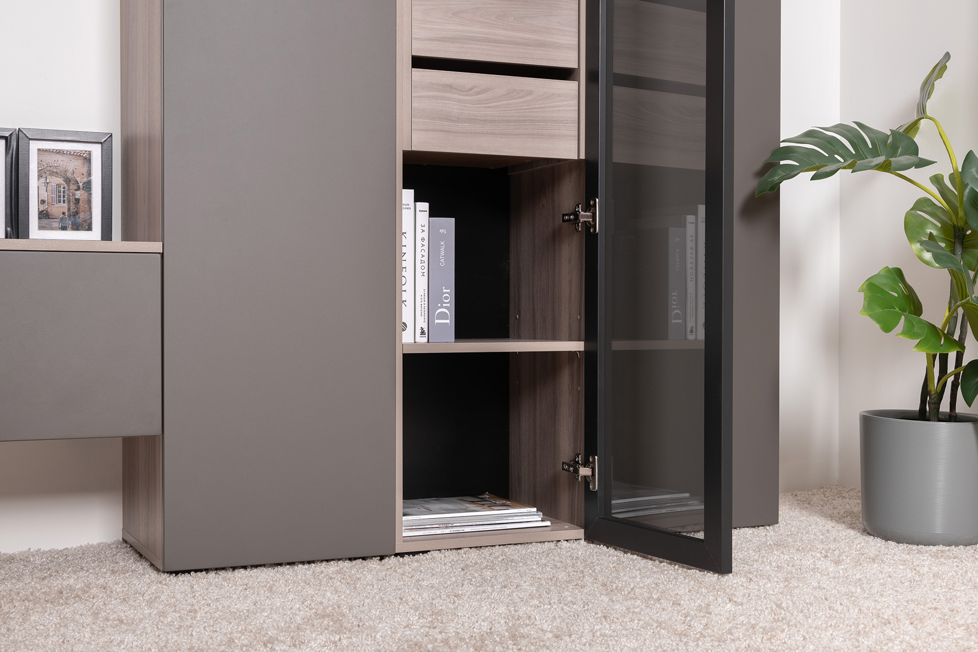 Разнообразие модулей и возможность их напольной и настенной установки позволит создать гостиную оптимальной конфигурации. Распашные фасады с механизмом push-to-open, направляющие скрытого монтажа в ящиках, петли с доводчиками, регулируемые опоры, крепеж в комплекте – комфорт продуман до мелочей.