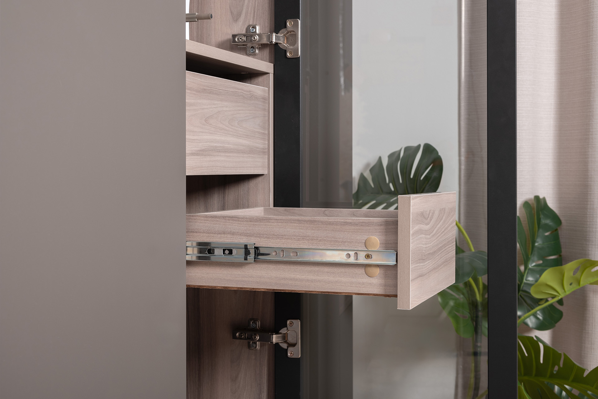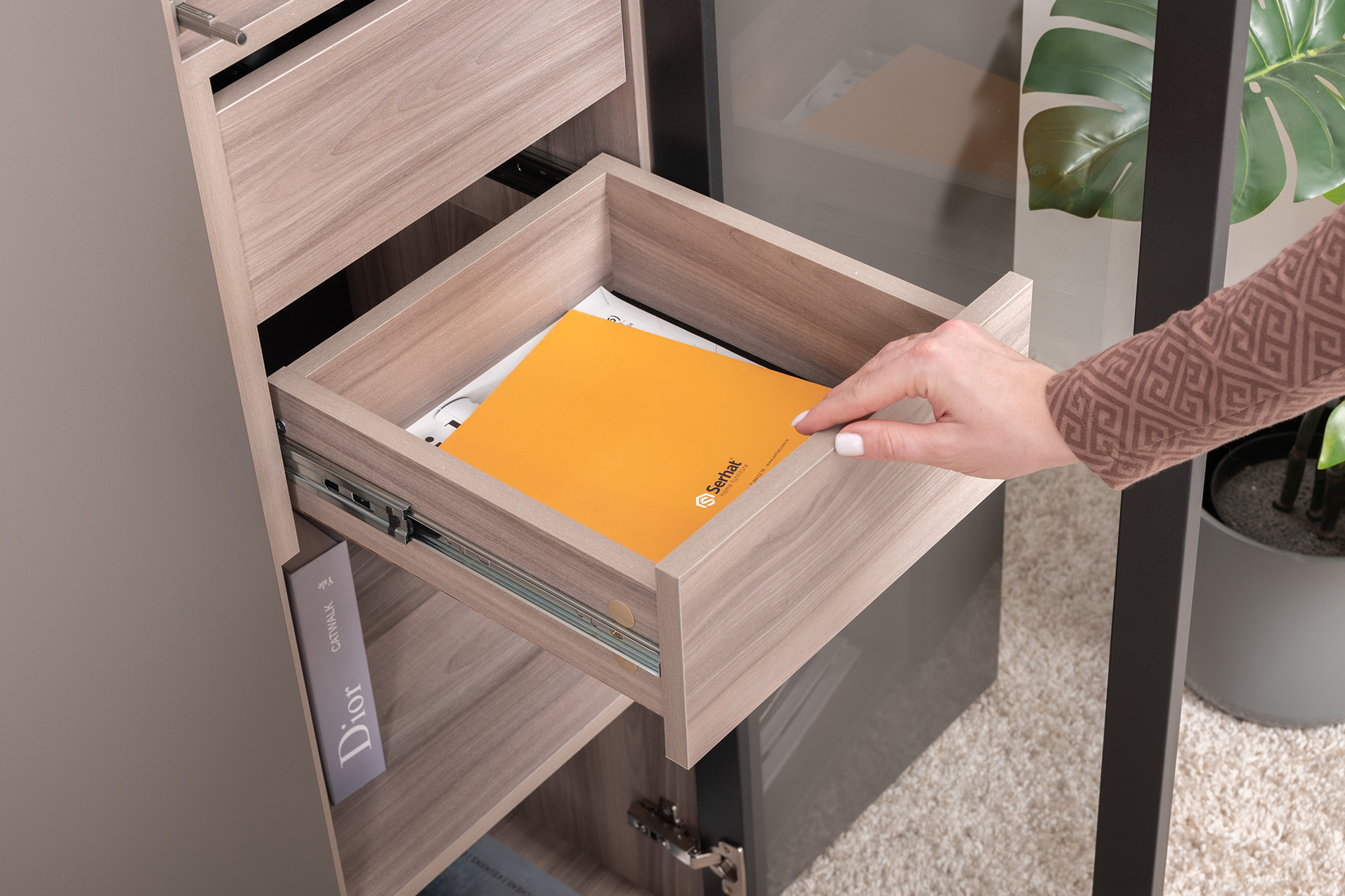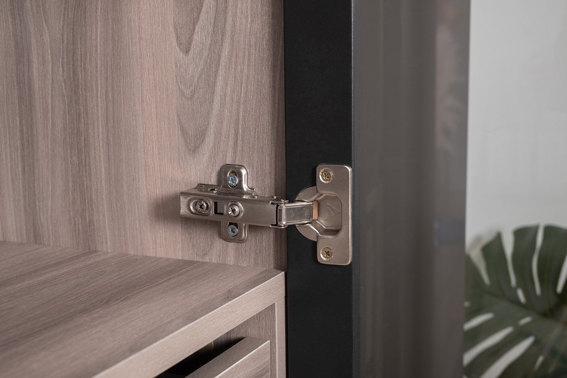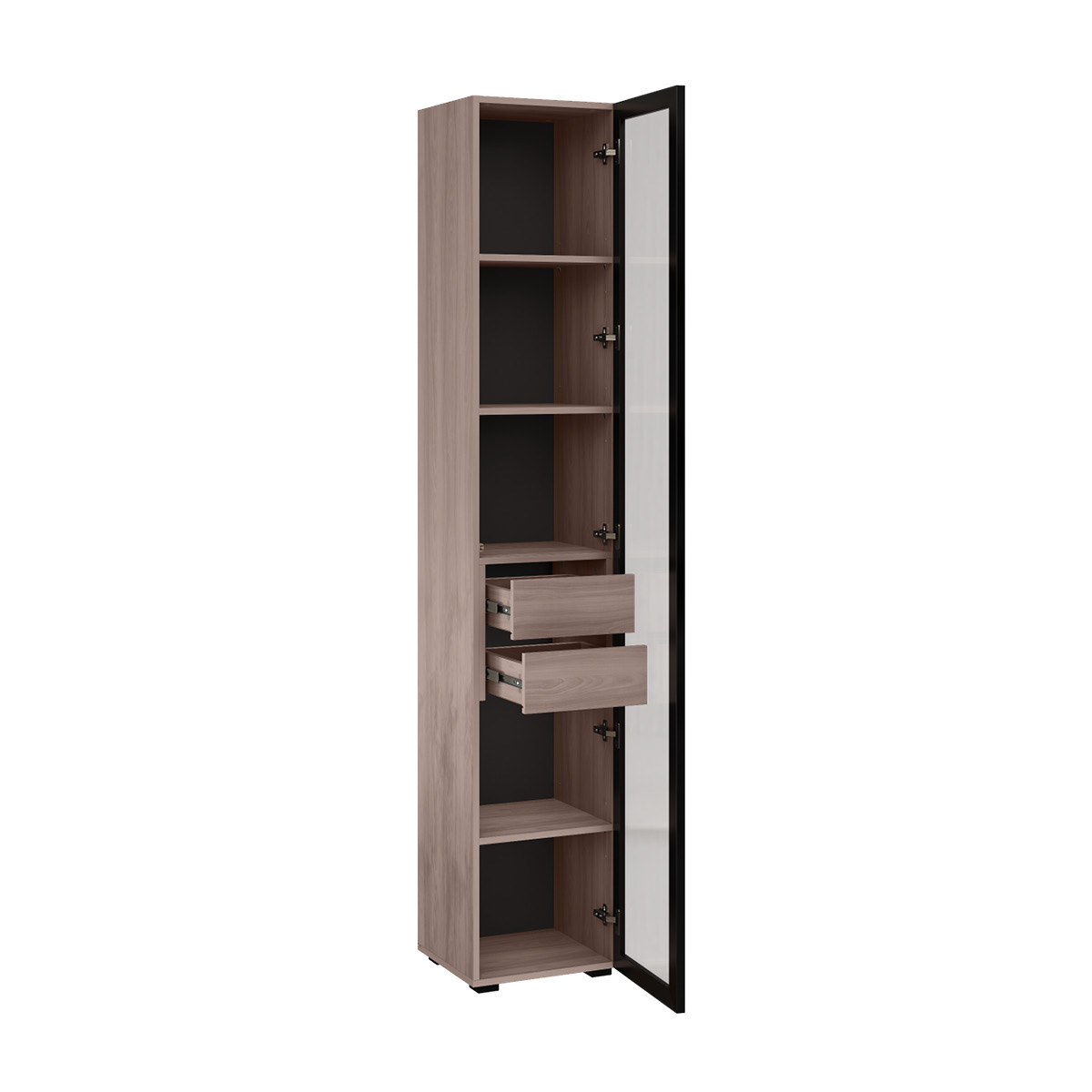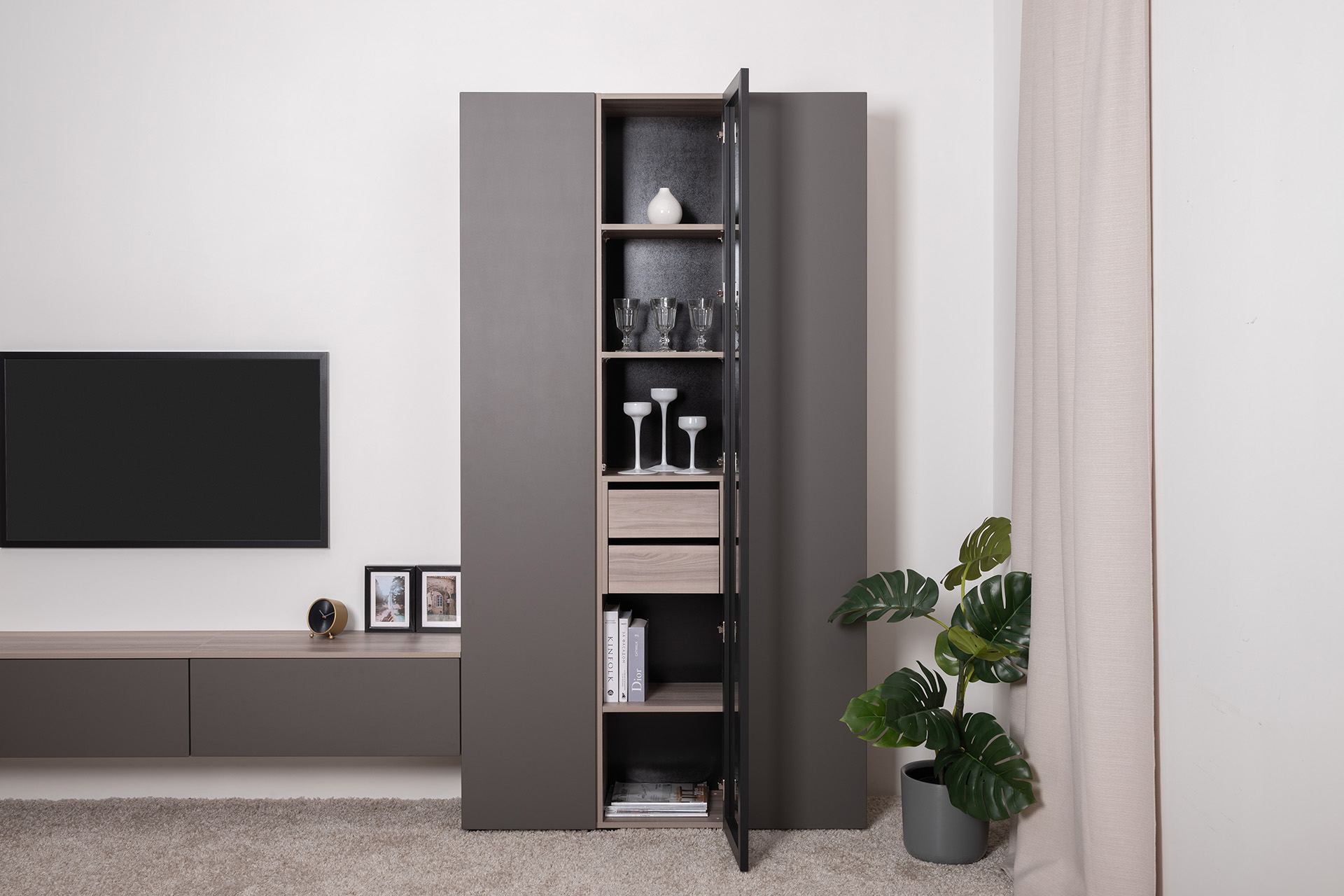 Разнообразие модулей и возможность их напольной и настенной установки позволит создать гостиную оптимальной конфигурации. Распашные фасады с механизмом push-to-open, направляющие скрытого монтажа в ящиках, петли с доводчиками, регулируемые опоры, крепеж в комплекте – комфорт продуман до мелочей.
