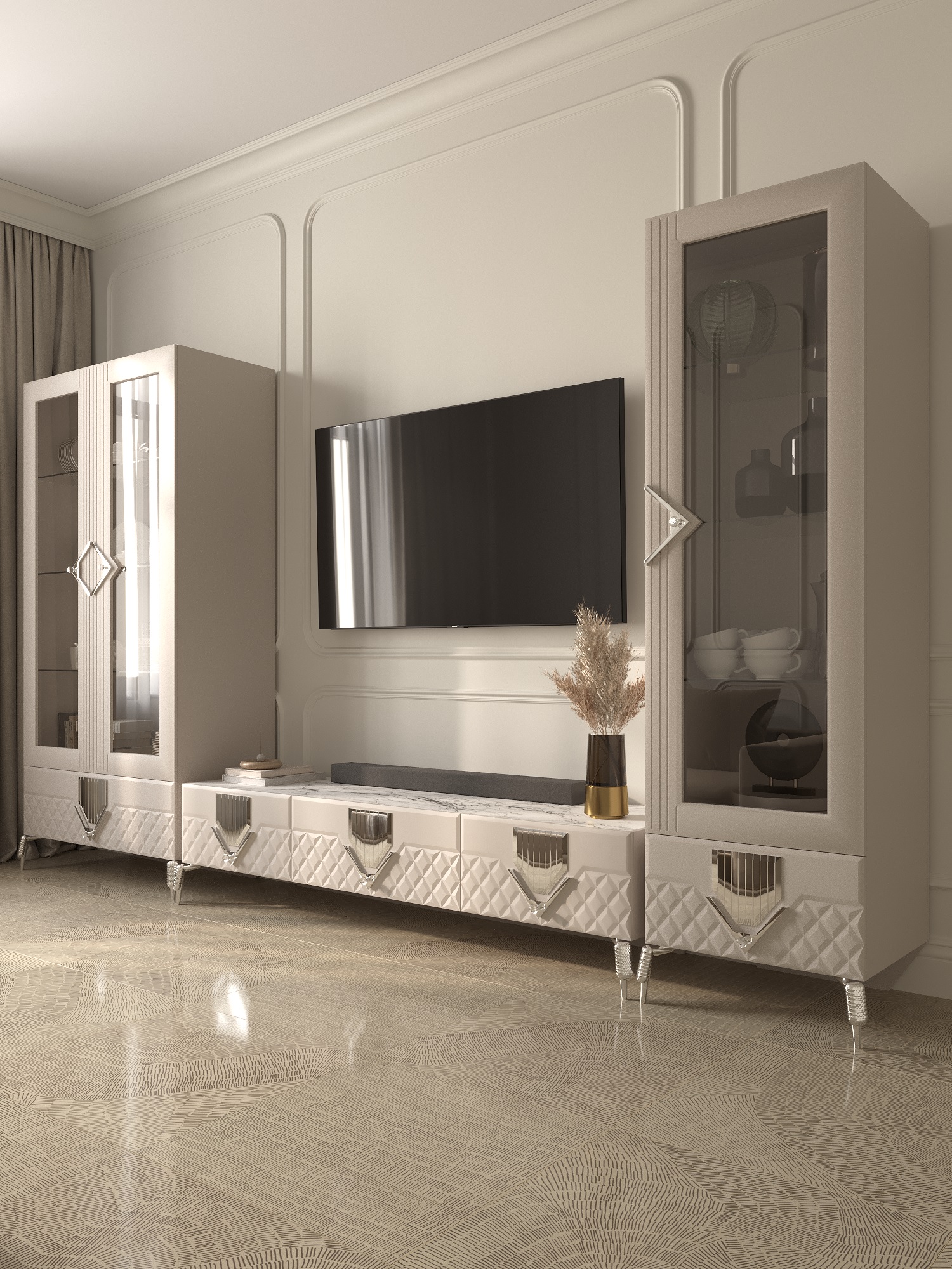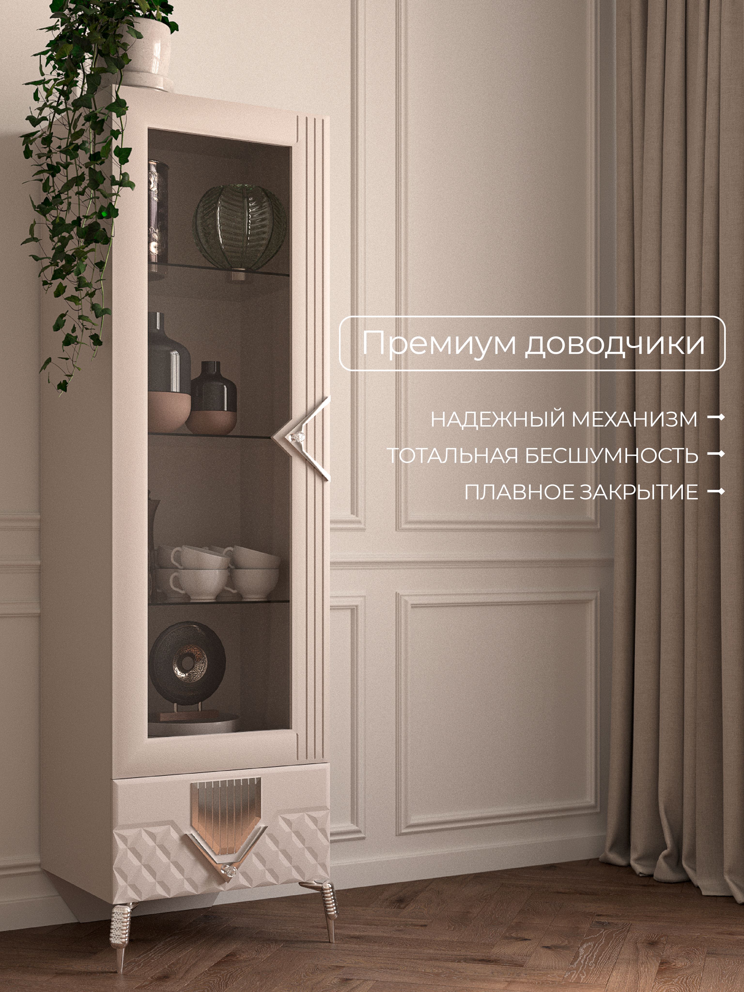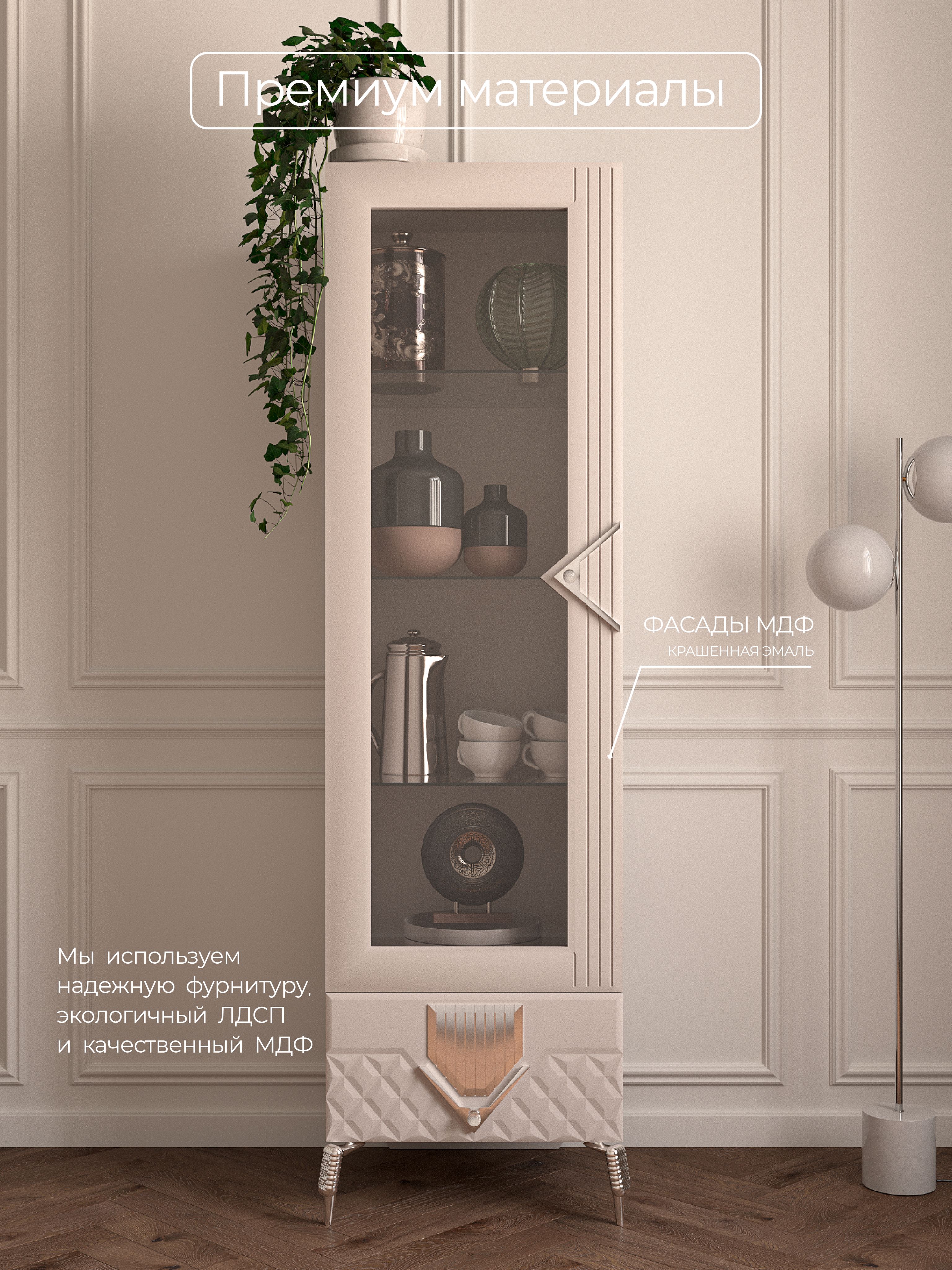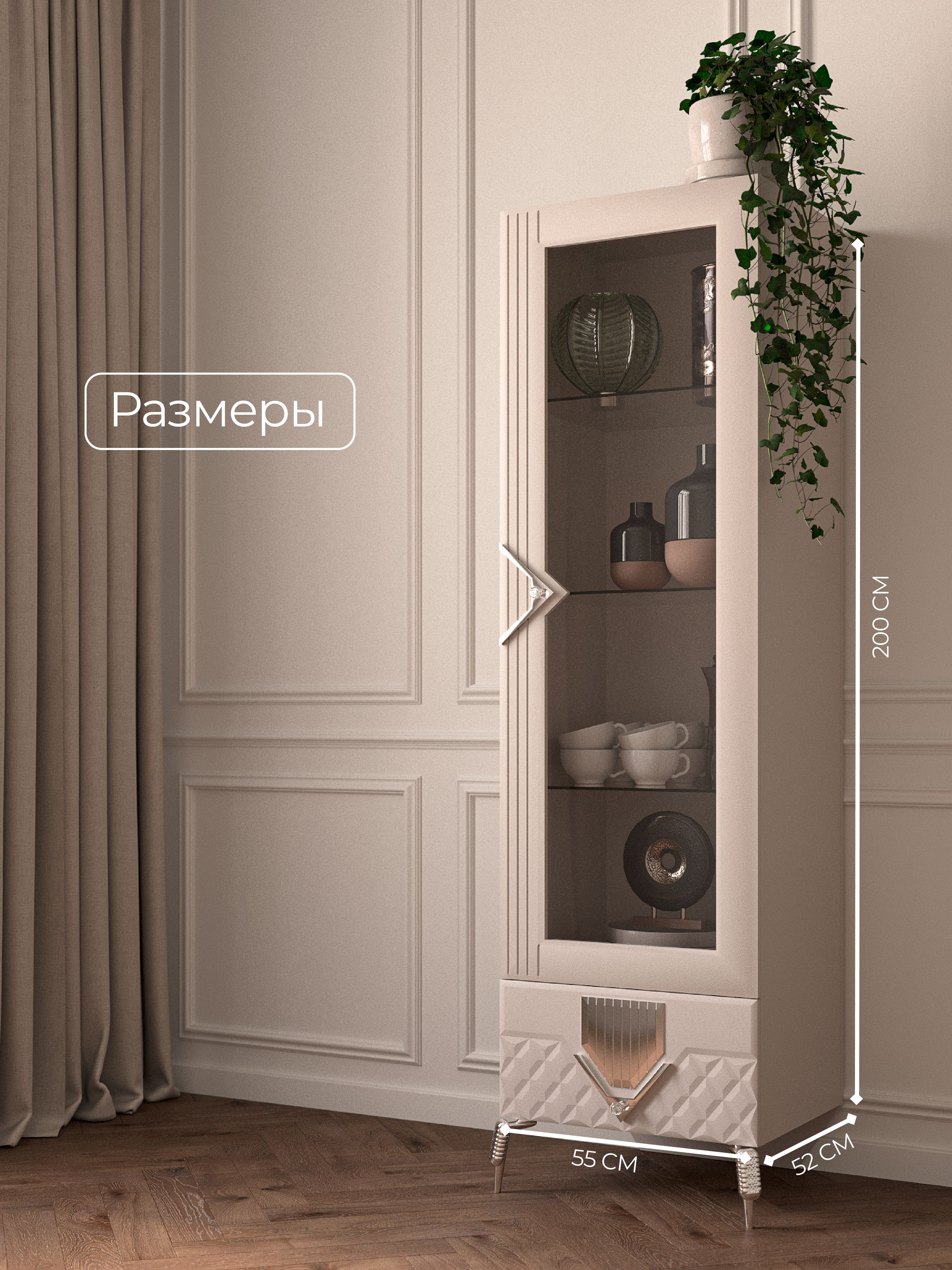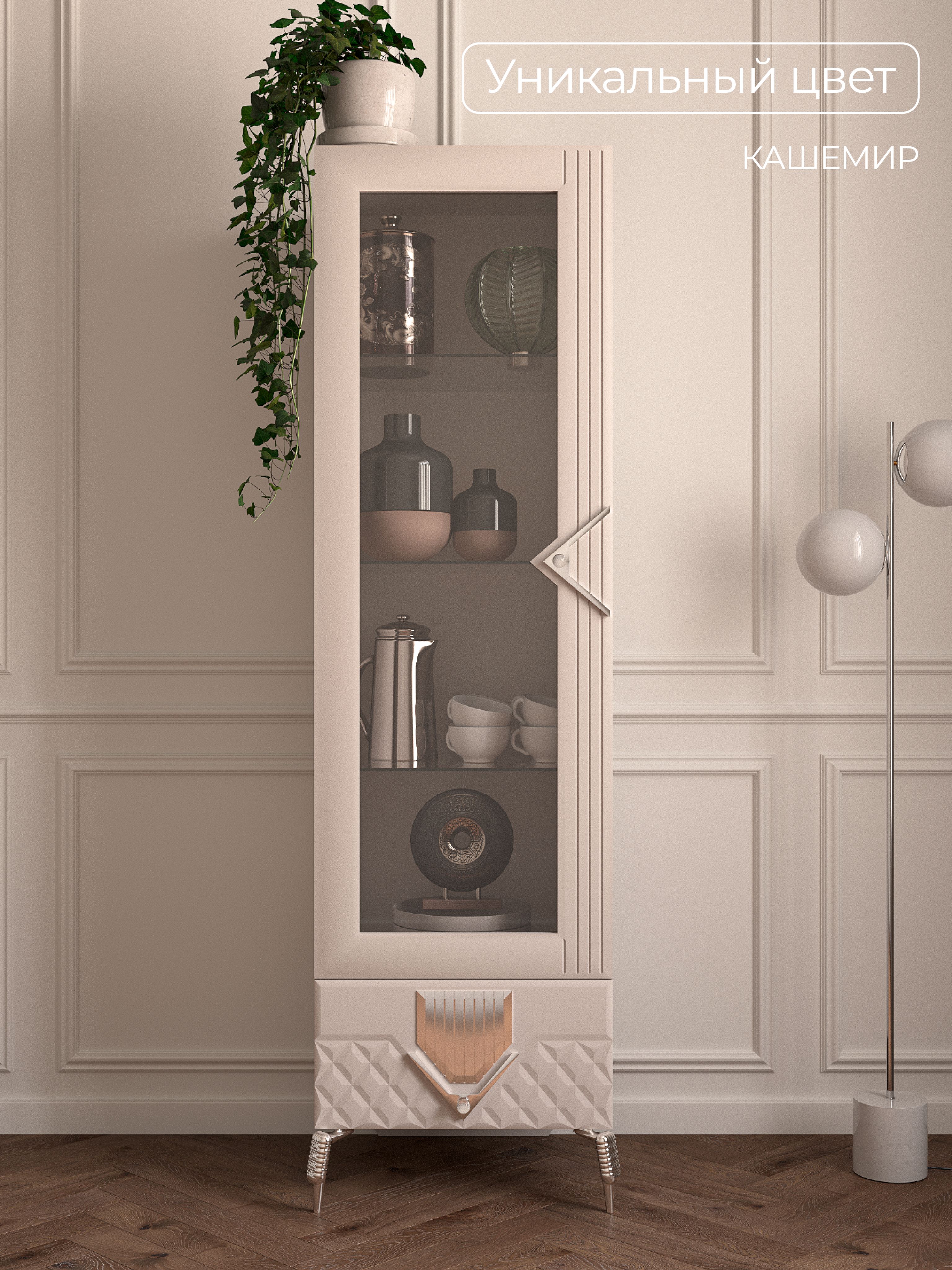 Шкаф 1-дверный «Савелья» в цвете «кашемир-серебро» выполнен в классическом стиле, что делает его универсальным для любого интерьера. Стеклянные элементы добавляют изящества и визуально расширяют пространство. Дверца открывается легко и плавно, обеспечивая удобный доступ к содержимому.Внутреннее пространство шкафа с распшашной дверцей, включает ящики для хранения различных предметов — от мелочей до более крупных вещей. Это делает его идеальным вариантом как для сервантов, буфетов, так и для книжных полок. Вы сможете удобно разместить в нем все необходимые вещи, сохранив порядок и организованность. Его элегантные формы и нежный оттенок «кашемир-серебро» гармонично вписываются в вашу гостиную или столовую.Данная мебель станет настоящей находкой для любителей минимализма и функциональности в интерьере, так как шкафчик узкий. Одностворчатый дизайн позволяет использовать шкафчик даже в небольших помещениях без потери стиля. Закрытое хранение помогает защитить ваши вещи от пыли, а застекленные двери дают возможность продемонстрировать ваш уникальный вкус. Будь то коллекция посуды или библиотека с книгами — этот напольный шкаф-пенал предложит вам удобное решение для организации пространства. Каждая чашка, каждая тарелка будет сверкать в лучах света, отражаясь от серебристого оттенка шкафа. Наслаждайтесь гармонией эстетики и практичности с этим красивым элементом мебели!Однодверный шкаф-витрина – это не просто функциональный предмет мебели, а изысканное дополнение к вашему интерьеру. Он создан, чтобы дарить уют и красоту, а его долговечность гарантирует, что он будет радовать вас долгие годы.«Савелья» - это не просто место для хранения, это элемент декора, который привносит в ваш дом атмосферу тепла и гостеприимства. Он будет притягивать взгляды и вызывать восхищение у ваших гостей. Прочность и качество материалов, из которых изготовлен шкаф, гарантируют его надежность и долгий срок службы. Вы сможете наслаждаться его красотой и функциональностью долгие годы, передавая его из поколения в поколение.