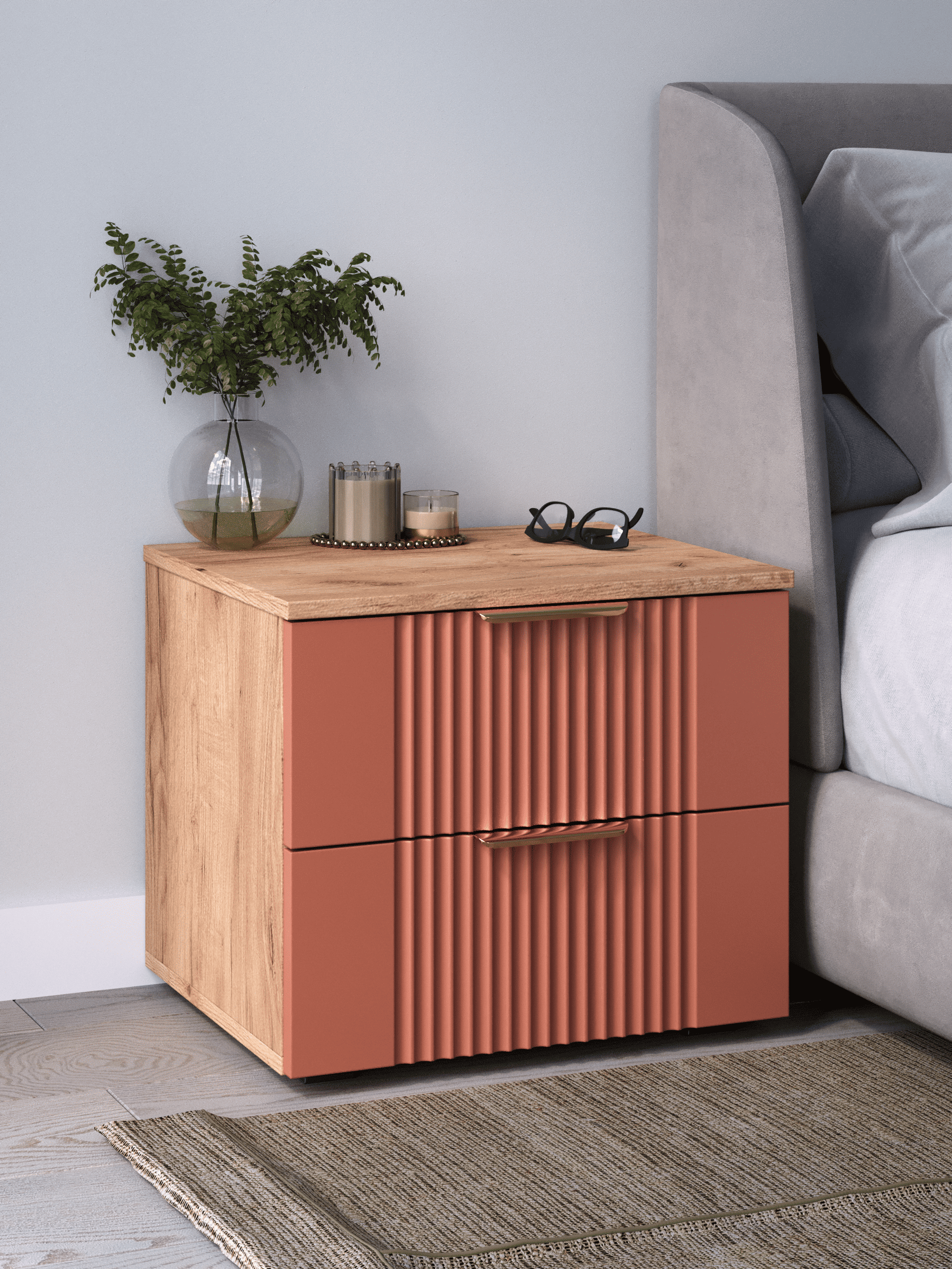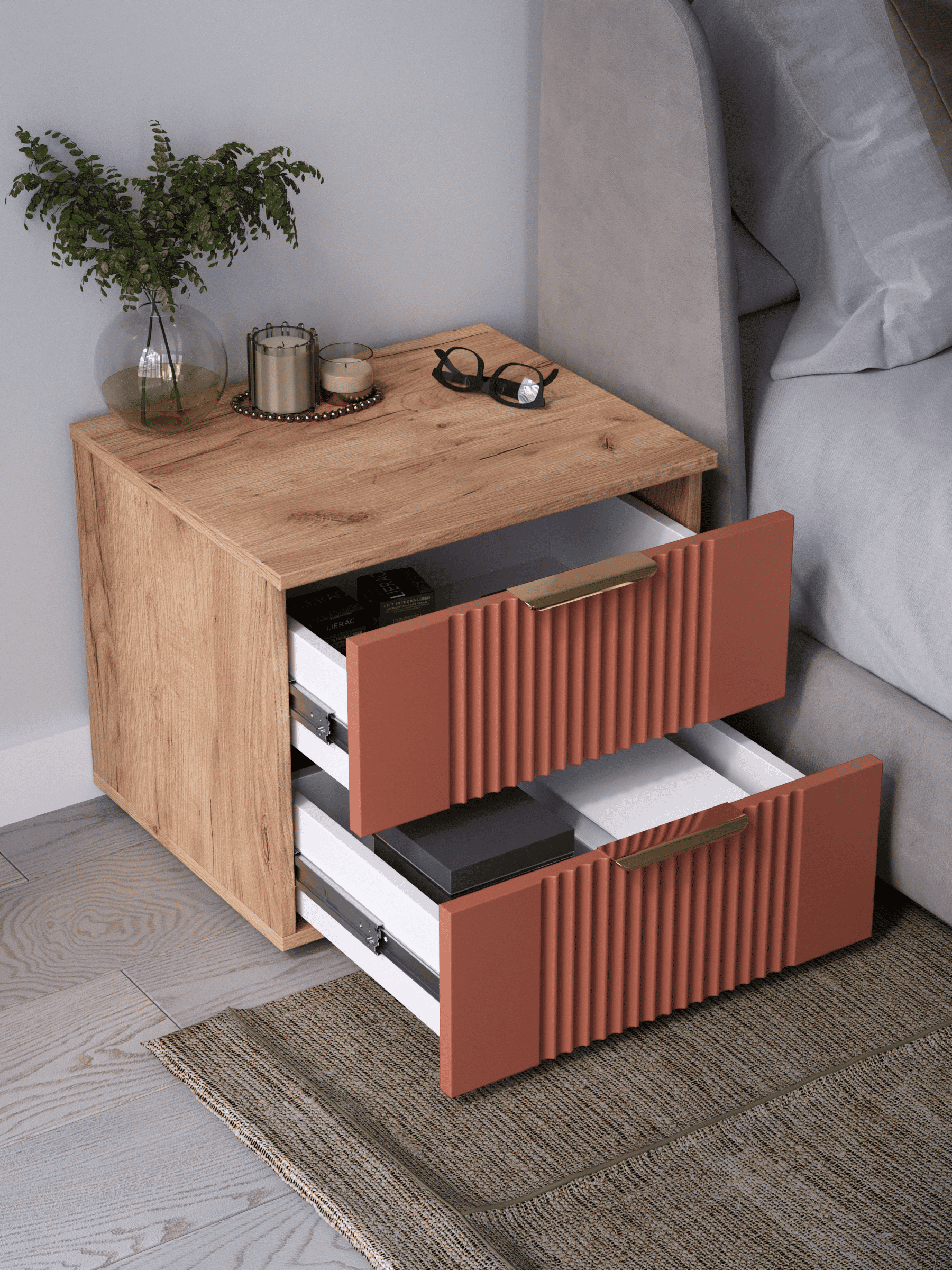Прикроватная тумба с ящиками, соединяет в себе комфорт, функциональность и эстетику. Наша прикроватная тумба напольная Ингрия Luxe 2 российского производства выглядят легко и современно, идеально впишется в лофт, скандинавский, современный, минимализм и прочие популярные стили интерьеров. Ее минималистичный дизайн придадут легкость и простор всему вашему интерьеру. Тумба напольная размером 50х44х42 (ШхВхГ) см, компактная тумба сэкономит пространство и организует грамотное хранение вещей. Тумба с двумя выдвижными ящиками изготовлен из материалов высокого качества. За высокопрочность и долговечность отвечает корпус, выполненный из ЛДСП, подходит для активного использования. За эстетику и лаконичность дизайна отвечает фасад из МДФ созданный путем сложной фрезеровки в виде стильного 3D рисунка. Накладная алюминиевая ручка 128 мм подчеркивает монолитный образ. За удобство и комфорт открывания отвечают шариковые направляющие (без доводчиков), с полным выдвижением. Ящики с такой системой открывания будут ходить практически бесшумно, и выдвигаться полностью, даже при повышенной нагрузке. Высокий мебельный модуль имеет регулируемые ножки, что позволит выставить узкий шкаф на устойчивую и нужную вам высоту. Небольшая тумба-столик поставляется в разобранном виде, пусть это вас не пугает. В комплекте предусмотрены все необходимые комплектующие, подробная инструкция и фурнитура, чтобы тумба прикроватная не отняла много времени на сборку. Современная мебель должна не только брать на себя пару задач по организации пространства, но и гармонично смотреться, выполняя нужные нам функции. Поэтому нашу тумбу можно использовать в разных помещениях в гостиной, спальне, прихожей (коридоре), в детской, в офисе, в салоне красоты, на балконе. Тумбочка Ингрия справится со всеми возложенными на нее функциями. Эта узкая тумба является очень вместительной, по этому вы можете использовать её как панель под телевизор, как модуль мебельный под одежду, ниша для вещей, полка под аквариум, тумба в прихожую, шкафчик под принтер, как прикроватная подставка, например, для телефона, стакана с водой, будильника и прочих мелочей, которые могут понадобиться среди ночи. Перед отправкой мебели, наши комоды и тумбы проходят проверку на наличие брака. Для целостности и сохранности каждого изделия мы разработали усиленную, надежную упаковку. Европейское качество от российского производителя - по доступным ценам.