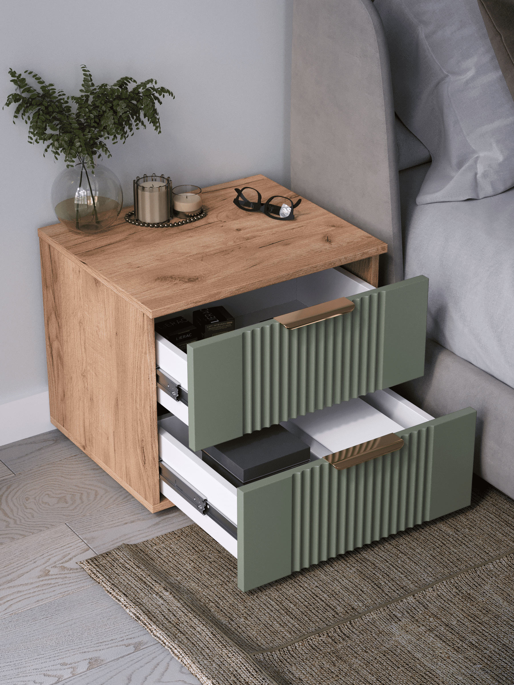 Прикроватная тумба с ящиками, соединяет в себе комфорт, функциональность и эстетику. Наша прикроватная тумба напольная Ингрия Luxe 2 российского производства выглядят легко и современно, идеально впишется в лофт, скандинавский, современный, минимализм и прочие популярные стили интерьеров. Ее минималистичный дизайн придадут легкость и простор всему вашему интерьеру. Тумба напольная размером 50х44х42 (ШхВхГ) см, компактная тумба сэкономит пространство и организует грамотное хранение вещей. Тумба с двумя выдвижными ящиками изготовлен из материалов высокого качества. За высокопрочность и долговечность отвечает корпус, выполненный из ЛДСП, подходит для активного использования. За эстетику и лаконичность дизайна отвечает фасад из МДФ созданный путем сложной фрезеровки в виде стильного 3D рисунка. Накладная алюминиевая ручка 128 мм подчеркивает монолитный образ. За удобство и комфорт открывания отвечают шариковые направляющие (без доводчиков), с полным выдвижением. Ящики с такой системой открывания будут ходить практически бесшумно, и выдвигаться полностью, даже при повышенной нагрузке. Высокий мебельный модуль имеет регулируемые ножки, что позволит выставить узкий шкаф на устойчивую и нужную вам высоту. Небольшая тумба-столик поставляется в разобранном виде, пусть это вас не пугает. В комплекте предусмотрены все необходимые комплектующие, подробная инструкция и фурнитура, чтобы тумба прикроватная не отняла много времени на сборку. Современная мебель должна не только брать на себя пару задач по организации пространства, но и гармонично смотреться, выполняя нужные нам функции. Поэтому нашу тумбу можно использовать в разных помещениях в гостиной, спальне, прихожей (коридоре), в детской, в офисе, в салоне красоты, на балконе. Тумбочка Ингрия справится со всеми возложенными на нее функциями. Эта узкая тумба является очень вместительной, по этому вы можете использовать её как панель под телевизор, как модуль мебельный под одежду, ниша для вещей, полка под аквариум, тумба в прихожую, шкафчик под принтер, как прикроватная подставка, например, для телефона, стакана с водой, будильника и прочих мелочей, которые могут понадобиться среди ночи. Перед отправкой мебели, наши комоды и тумбы проходят проверку на наличие брака. Для целостности и сохранности каждого изделия мы разработали усиленную, надежную упаковку. Европейское качество от российского производителя - по доступным ценам.