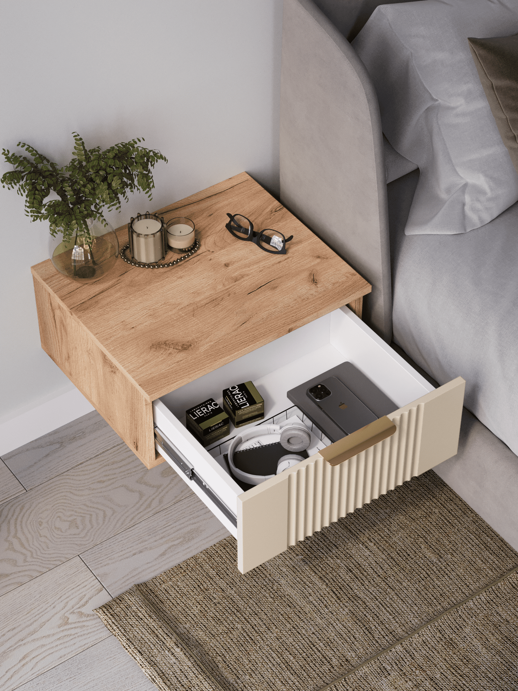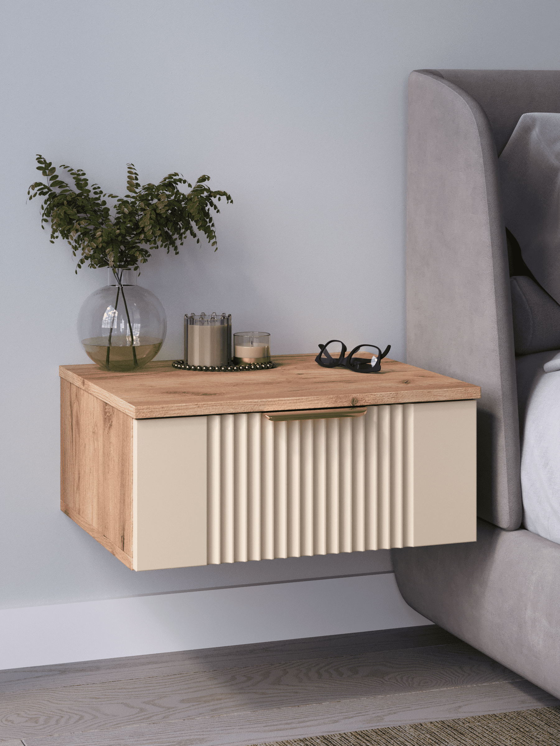 Подвесная прикроватная тумба с ящиком, соединяет в себе комфорт, функциональность и эстетику. Сегодня в тренде – стильные подвесные тумбы. Наша тумба подвесная российского производства выглядят легко и современно, идеально впишется в лофт, скандинавский, современный, минимализм и прочие популярные стили интерьеров. Ее минималистичный дизайн, невесомая конструкция и поразительная вместительность - придадут легкость и простор всему вашему интерьеру. Консоль подвесная размером 50х22х42 (ДхВхГ) см, сэкономит пространство и организует грамотное хранение вещей. Шкафчик навесной изготовлен из материалов высокого качества. За высокопрочность и долговечность отвечает корпус, выполненный из ЛДСП, подходит для активного использования. За эстетику и лаконичность дизайна отвечает фасад из МДФ созданный путем сложной фрезеровки в виде стильного 3D рисунка. Наша тумба прикроватная подвесная оснащена системой открывания push to open, которая подчеркивает монолитный образ. За удобство и комфорт открывания отвечают шариковые направляющие (без доводчиков). Ящик с такой системой открывания будет ходить практически бесшумно и выдвигаться полностью, даже при повышенной нагрузке (до 8 кг). Сборка этой узкой тумбы не требует особых навыков и не отнимет много времени. В комплекте для сборки настенного комода вы найдете все необходимые комплектующие и фурнитуру, что позволит вам легко и быстро собрать ее самостоятельно. Современная мебель должна не только брать на себя пару задач по организации пространства, но и гармонично смотреться. С этой задачей в интерьере справится шкаф с ящиком, который можно использовать в качестве прикроватной тумбы для хранения необходимых предметов рядом с кроватью в спальне. Тумбочка также может стать отличным туалетным столиком, где можно поместить любимую косметику и аксессуары для ухода за собой. Тумба прикроватная Ингрия-1 отлично прослужит как тумба в прихожую или в коридор, внутри нее можно хранить ключи или другие мелкие предметы. Благодаря возможности навесить тумбу на стену на нужной высоте, появится возможность оптимально использовать пространство комнаты. Это особенно актуально для небольших помещений, где каждый квадратный метр имеет значение. Особенно полезной полка с выдвижным ящиком будет в офисных помещениях, так как эта офисная тумба придаст лаконичности и удобства любому помещению. Тумба навесная Ингрия найдет применение и в салонах красоты и в детских комнатах. Почувствуйте себя дизайнером создайте уют с помощью нашей многофункциональной ниши для хранения.