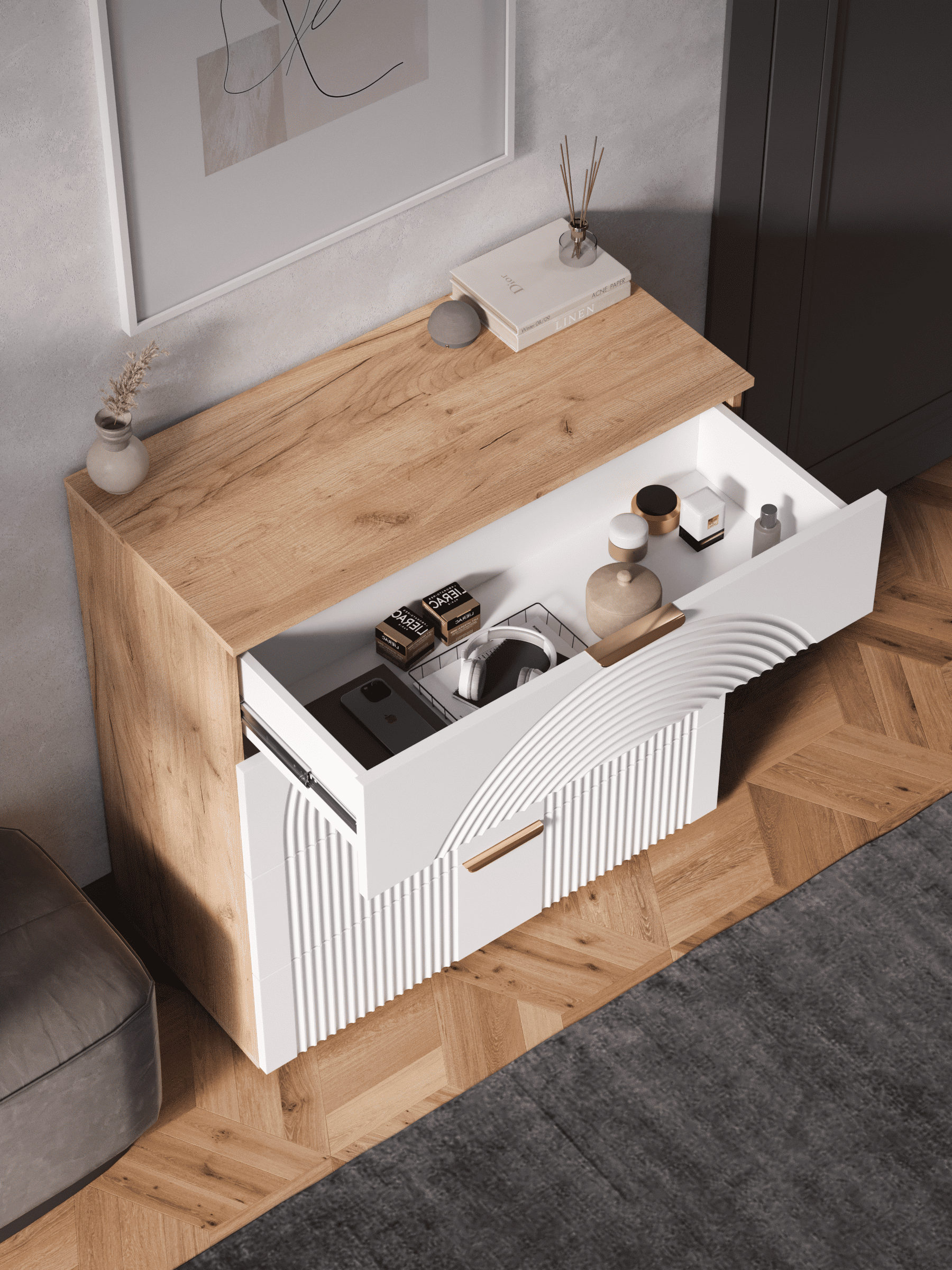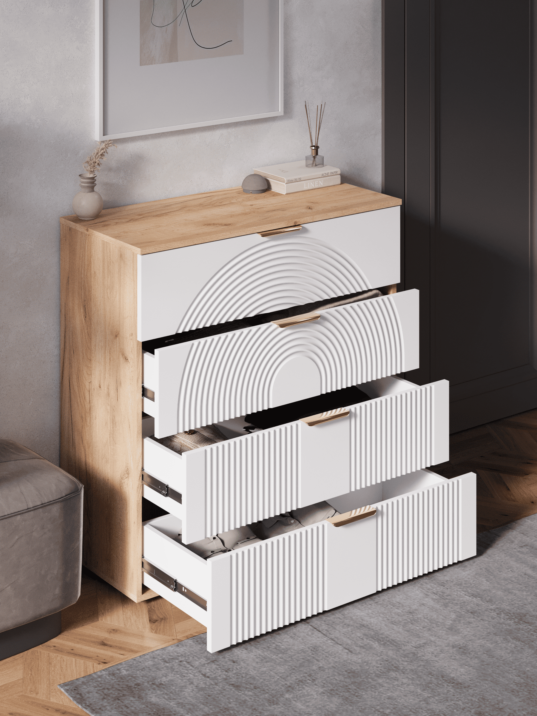 Стильный и практичный комод с ящиками, решит как минимум две ваших задачи, будет служить многофункциональной нишей для хранения вещей, одежды, белья и универсальной подставкой для различных предметов интерьера, а также можно использовать в виде тумбы под телевизор. Наша коллекция Ингрия российского производства выглядят легко и современно, идеально впишется в лофт, скандинавский, современный, минимализм и прочие популярные стили интерьеров. Его минималистичный дизайн придаст легкость и простор всему вашему интерьеру. Комод компактный и сэкономит пространство и организует грамотное хранение вещей. Комод имеет 4 выдвижных ящика. За удобство и комфорт открывания ящиков отвечают шариковые направляющие (без доводчиков), с полным выдвижением. Ящики с такой системой открывания будут ходить практически бесшумно, и выдвигаться полностью, даже при повышенной нагрузке. Ножки изготовлены из прочного массива дерева. Комод изготовлен из материалов высокого качества. За высокопрочность и долговечность отвечает корпус, выполненный из ЛДСП, подходит для активного использования. За эстетику и лаконичность дизайна отвечает фасад из МДФ созданный путем сложной фрезеровки в виде 3D рисунка. Накладные алюминиевые ручки для комода подчеркнут монолитный образ. Комод поставляется в разобранном виде, пусть это вас не пугает. В комплекте предусмотрены все необходимые комплектующие, подробная инструкция и фурнитура. Сборка комода серого с ящиками не потребует особых навыков и не отнимет много времени. Современная мебель для дома должна не только брать на себя пару задач по организации пространства, но и гармонично смотреться, выполняя нужные нам функции. Поэтому комод можно использовать в разных помещениях в гостиной, спальне, прихожей (коридоре), в детской для игрушек, в офисе, в салоне красоты, на балконе. Комод для вещей справится со всеми возложенными на него функциями. Перед отправкой мебели, каждое изделие проходит проверку на наличие брака. Для целостности и сохранности каждого изделия мы разработали усиленную, надежную упаковку. Европейское качество от российского производителя - по доступным ценам.