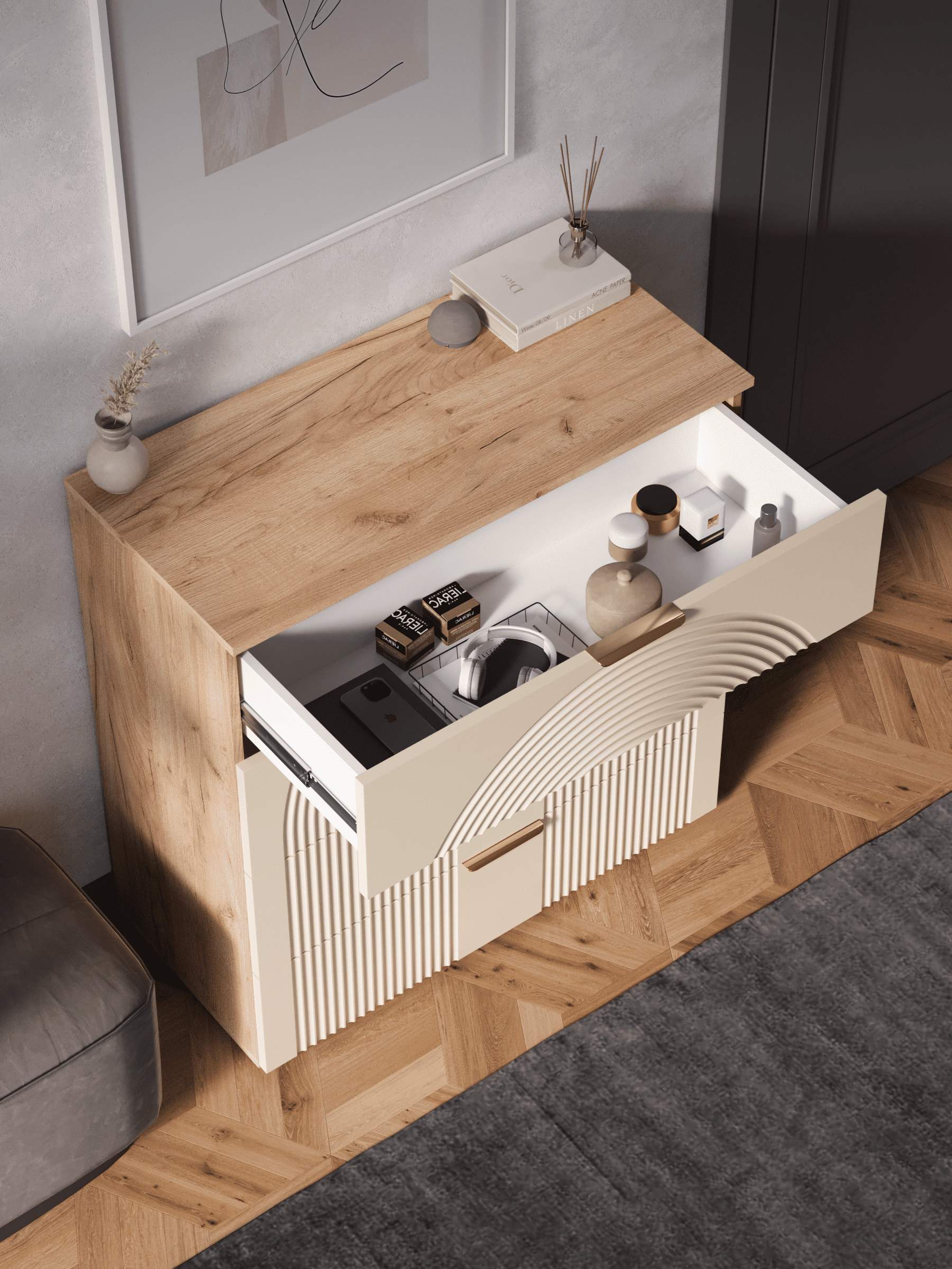 Стильный и практичный комод с ящиками, решит как минимум две ваших задачи, будет служить многофункциональной нишей для хранения вещей, одежды, белья и универсальной подставкой для различных предметов интерьера, а также можно использовать в виде тумбы под телевизор. Наша коллекция Ингрия российского производства выглядят легко и современно, идеально впишется в лофт, скандинавский, современный, минимализм и прочие популярные стили интерьеров. Его минималистичный дизайн придаст легкость и простор всему вашему интерьеру. Комод компактный и сэкономит пространство и организует грамотное хранение вещей. Комод имеет 4 выдвижных ящика. За удобство и комфорт открывания ящиков отвечают шариковые направляющие (без доводчиков), с полным выдвижением. Ящики с такой системой открывания будут ходить практически бесшумно, и выдвигаться полностью, даже при повышенной нагрузке. Ножки изготовлены из прочного массива дерева. Комод изготовлен из материалов высокого качества. За высокопрочность и долговечность отвечает корпус, выполненный из ЛДСП, подходит для активного использования. За эстетику и лаконичность дизайна отвечает фасад из МДФ созданный путем сложной фрезеровки в виде 3D рисунка. Накладные алюминиевые ручки для комода подчеркнут монолитный образ. Комод поставляется в разобранном виде, пусть это вас не пугает. В комплекте предусмотрены все необходимые комплектующие, подробная инструкция и фурнитура. Сборка комода серого с ящиками не потребует особых навыков и не отнимет много времени. Современная мебель для дома должна не только брать на себя пару задач по организации пространства, но и гармонично смотреться, выполняя нужные нам функции. Поэтому комод можно использовать в разных помещениях в гостиной, спальне, прихожей (коридоре), в детской для игрушек, в офисе, в салоне красоты, на балконе. Комод для вещей справится со всеми возложенными на него функциями. Перед отправкой мебели, каждое изделие проходит проверку на наличие брака. Для целостности и сохранности каждого изделия мы разработали усиленную, надежную упаковку. Европейское качество от российского производителя - по доступным ценам.