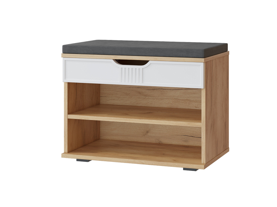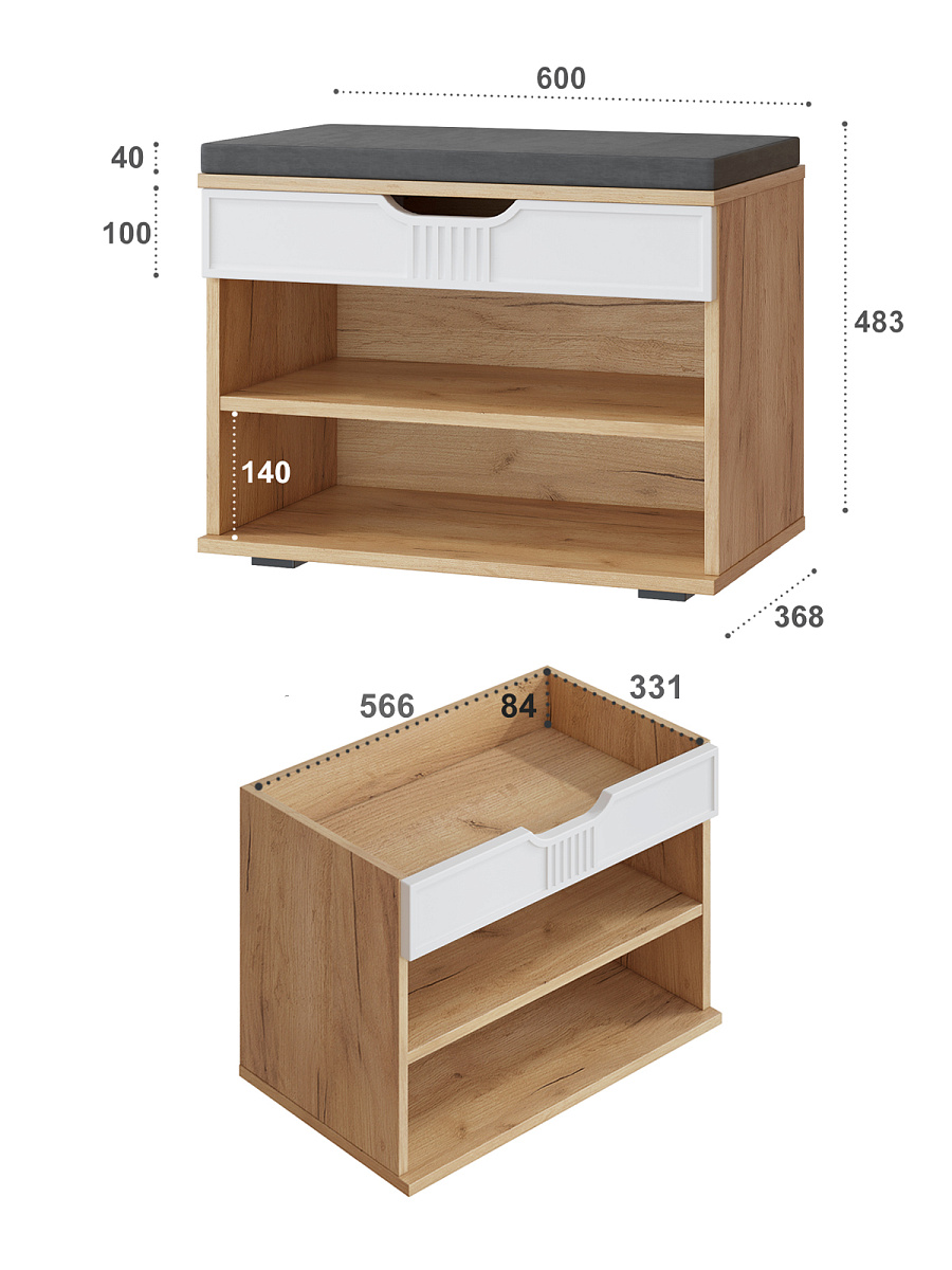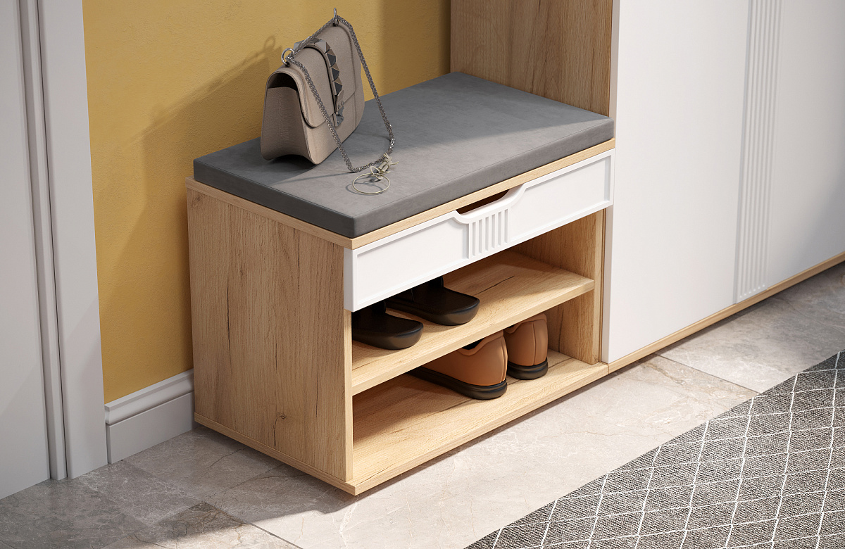 Тумба для обуви Эмилия ЭЛ-44К – компактная модель для комфортного переобувания в прихожую. Лаконичное изделие оборудовано двумя полками для обуви и мягким сиденьем, под которым находится удобный ящик для хранения чистящих средств, щеток или зонта. Ткань мягкой части велюр, наполнение: поролон 40 мм, синтепон, белый флизелин. Высота опоры 20 мм.
